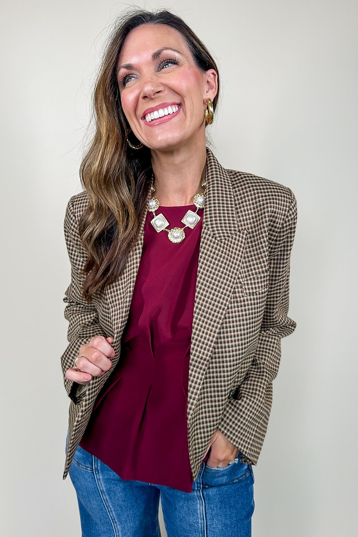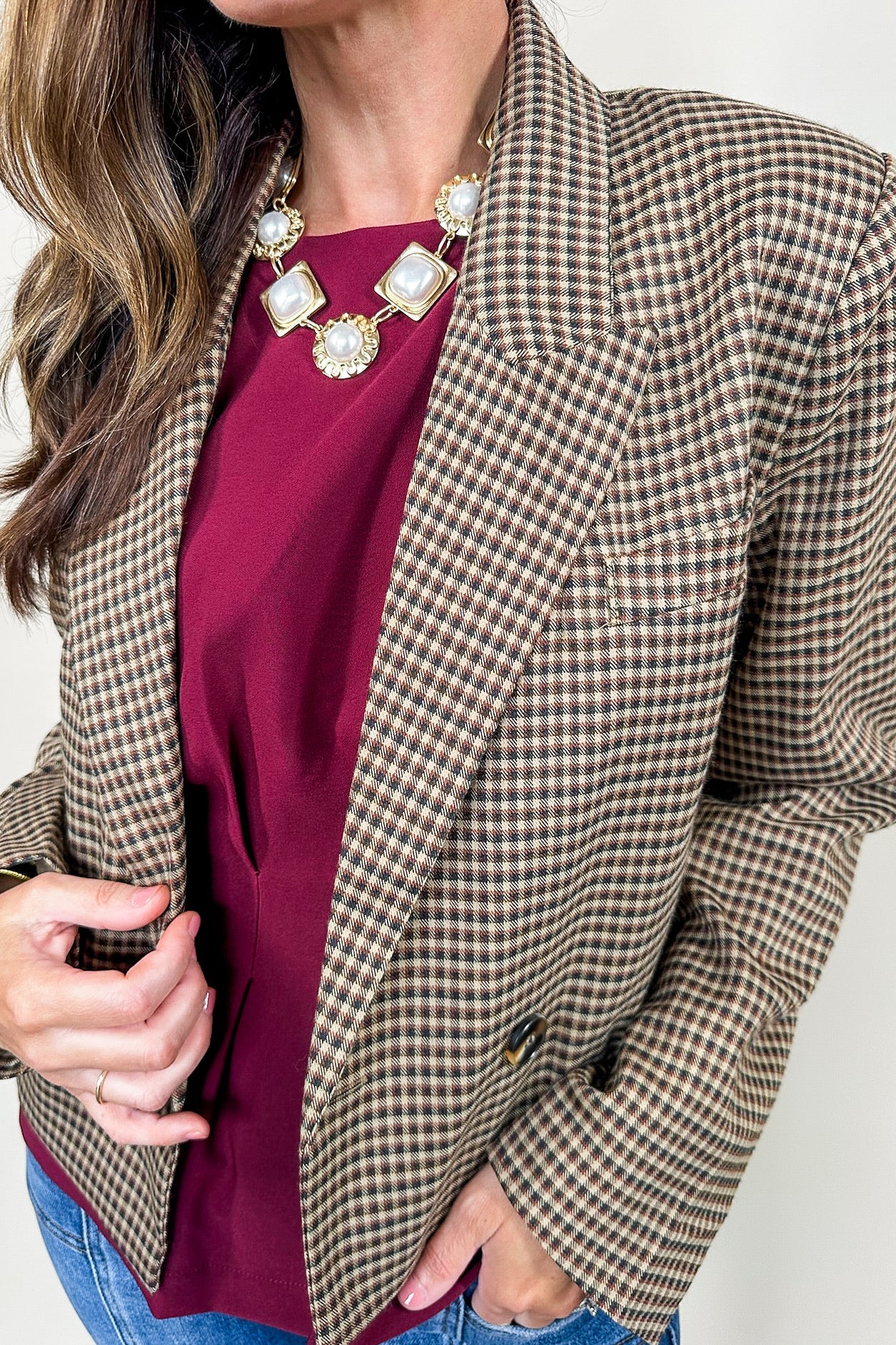 This Brown Gingham Print Cropped Jett Pocketed Blazer Jacket exudes fall vibes and sophistication. Featuring buttons and shoulder pads, it's perfect for creating a classy and professional look. Pair with a black mock neck layering top and denim or dress pants for a flawless fall ensemble. Elevate your wardrobe with this classy piece!