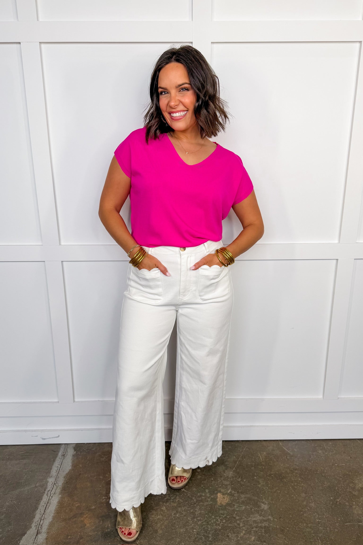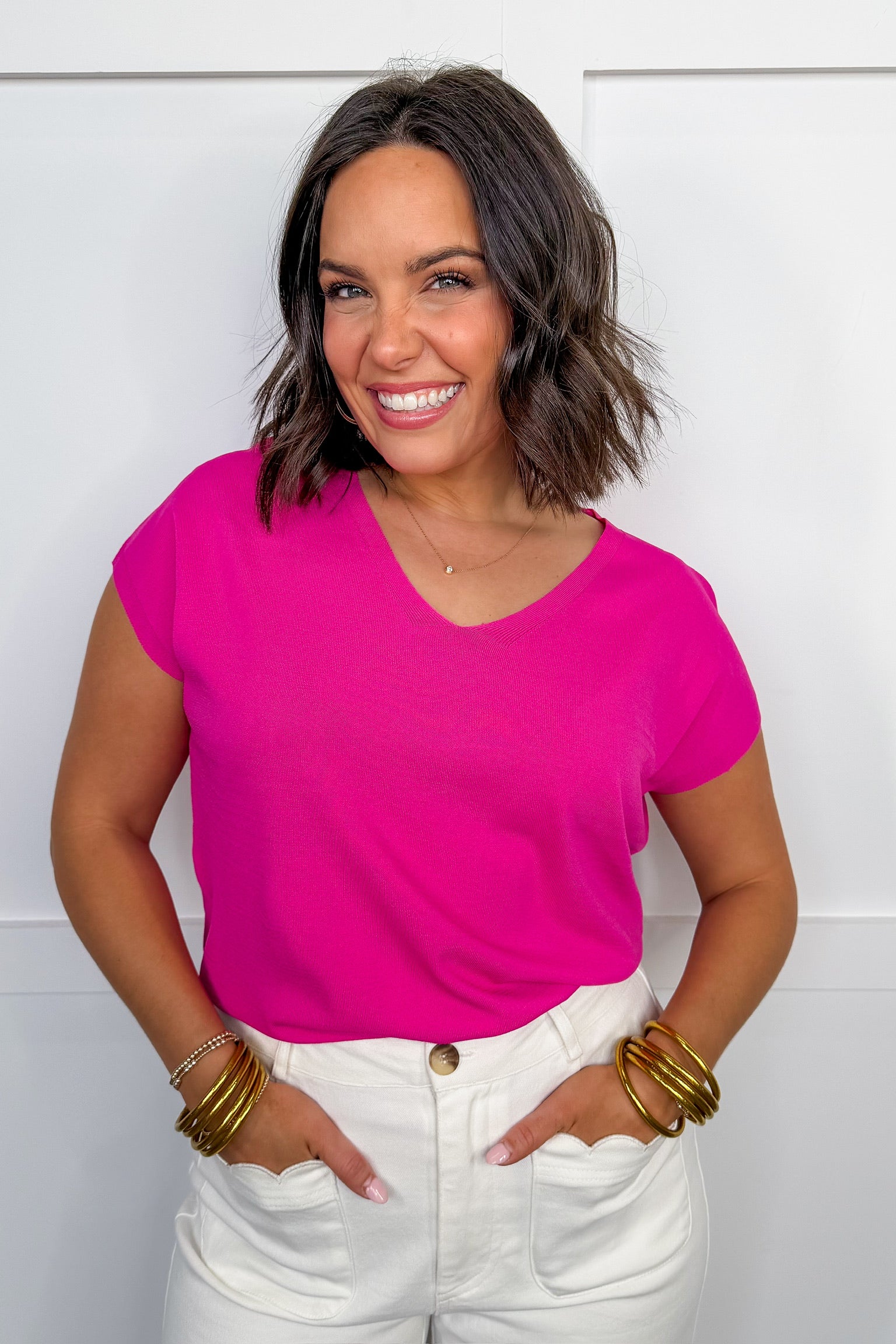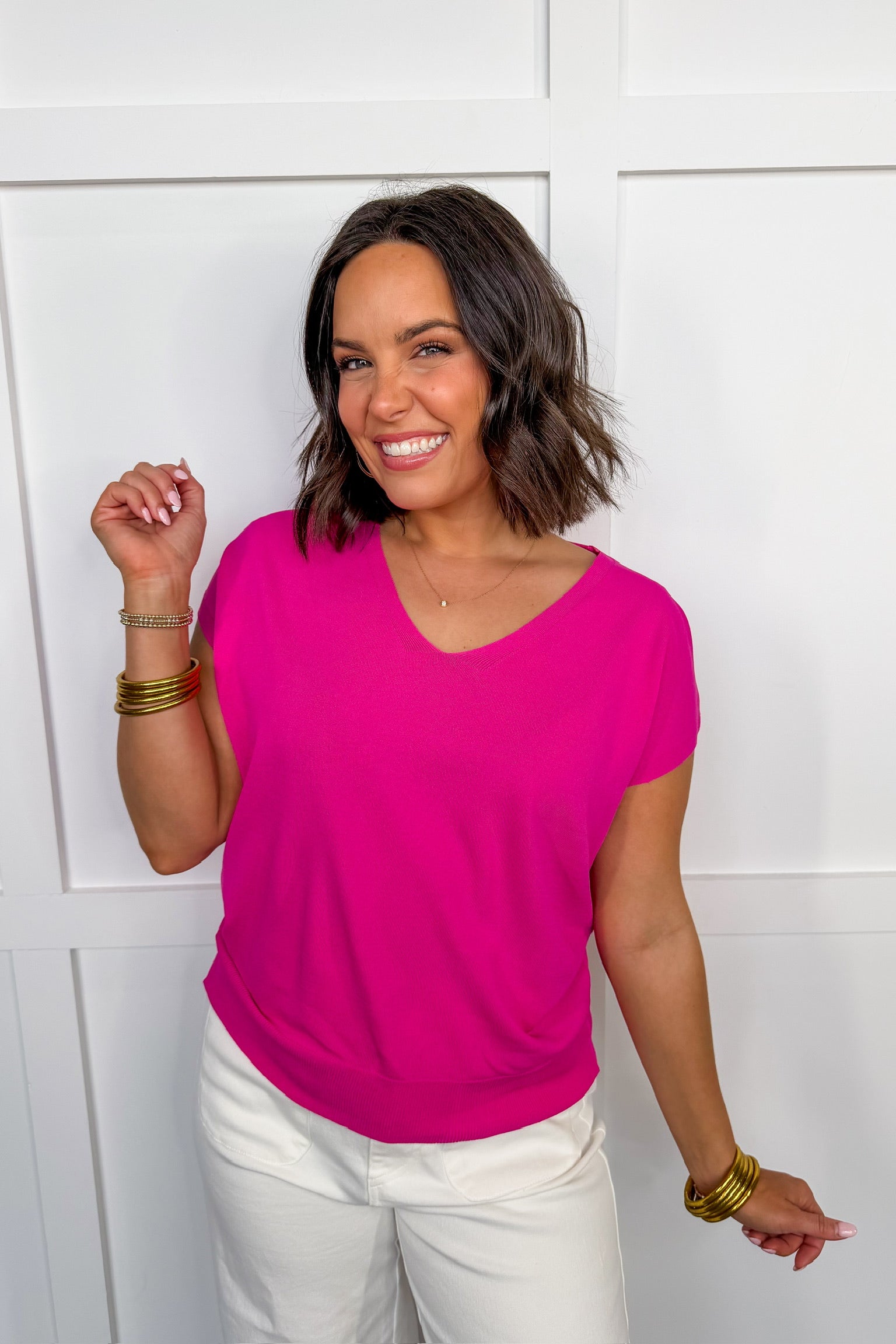 Bright, bold, and effortlessly flattering, the Pink Perfection V-Neck Top is a feel-good staple you’ll reach for again and again. Designed with a clean v-neckline and an easy, relaxed silhouette, this top delivers the perfect pop of color while staying timeless and wearable. Dress it up with tailored bottoms or keep it casual with denim—this piece does it all.