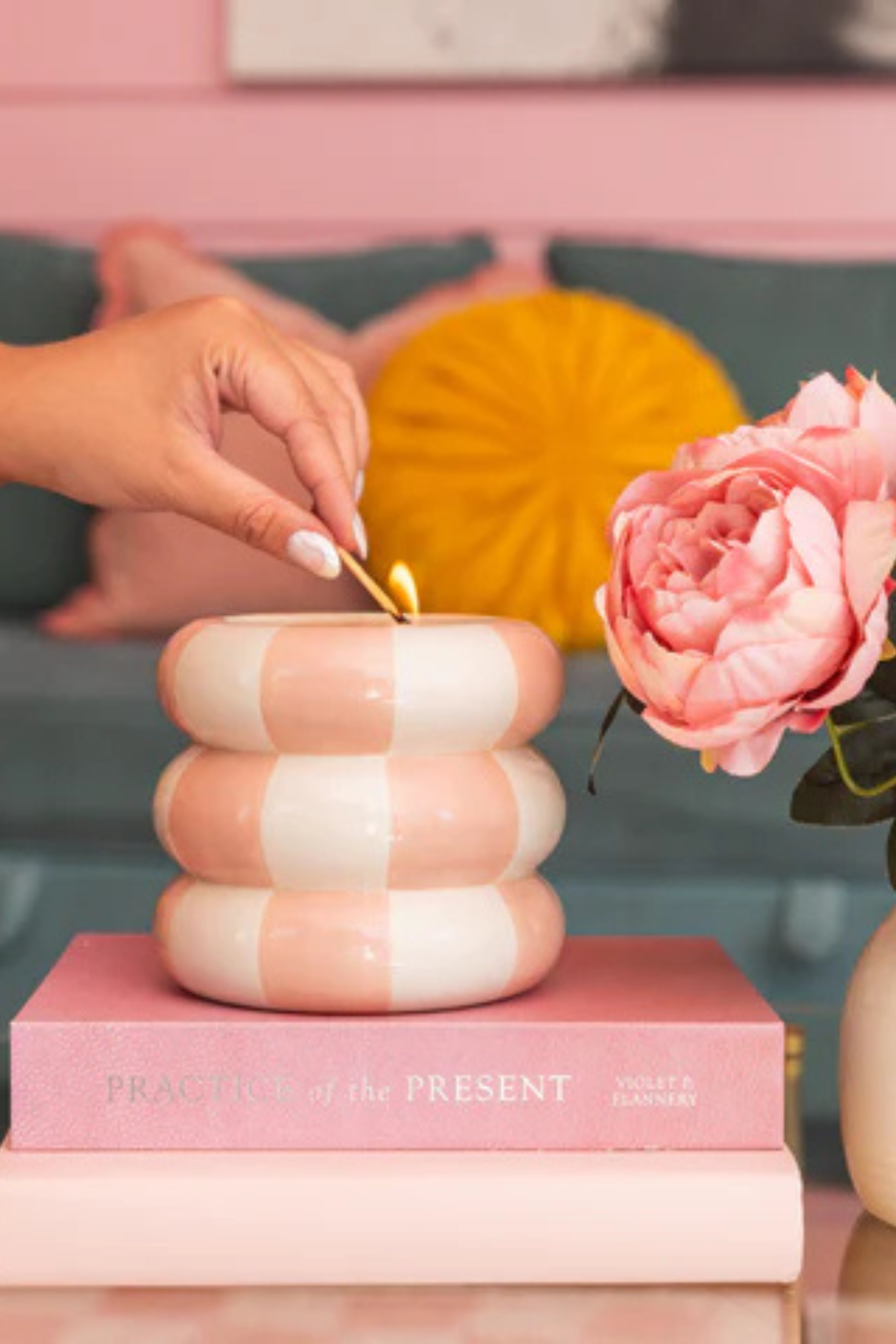 Add a playful pop of style with Sweet Grace Candle #074. Featuring a charming ceramic vessel adorned with a pink checkered pattern, this candle is a statement piece all on its own. Filled with 25.5 oz of our exclusive soy-blend wax, it offers up to 90 hours of burn time, filling your home with the beloved Sweet Grace fragrance you know and love.