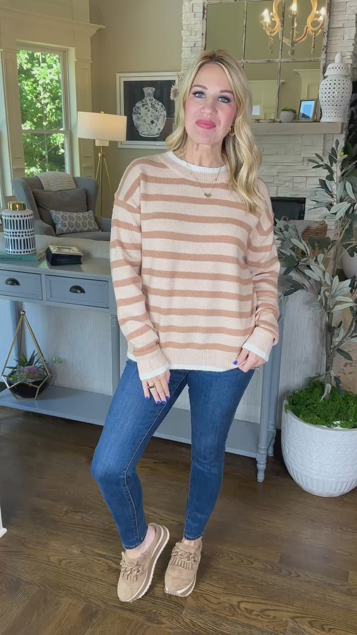 Get cozy and stand out with our Golden Hour Striped White Trim Knit Sweater. Featuring a unique blend of gold and brown tones, this sweater will keep you warm and stylish during those chilly days. Embrace the golden hour in comfort and style!