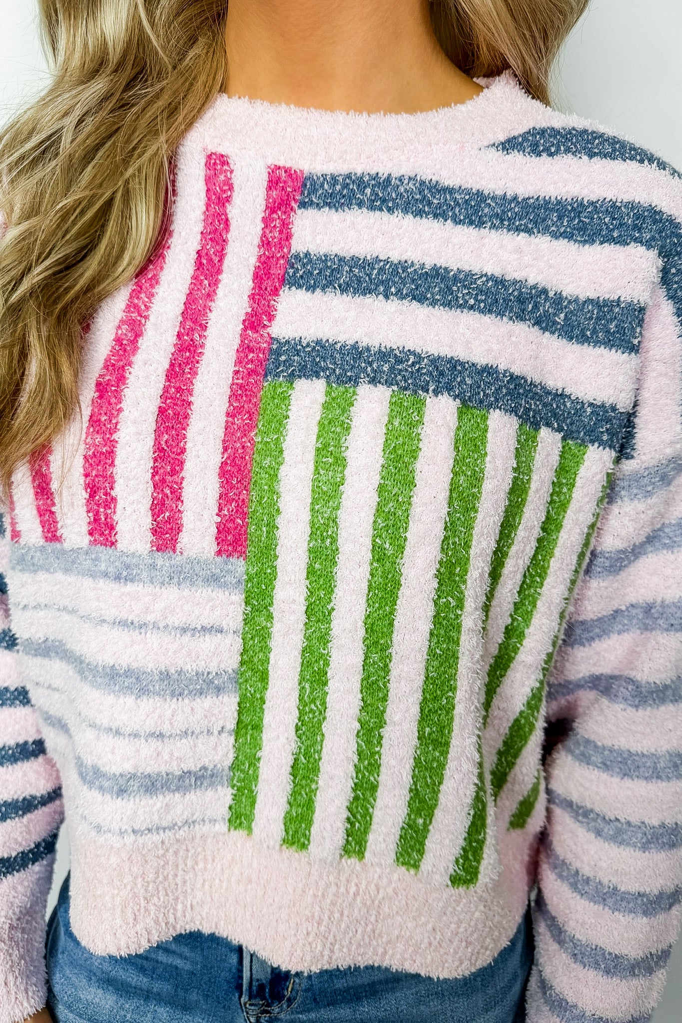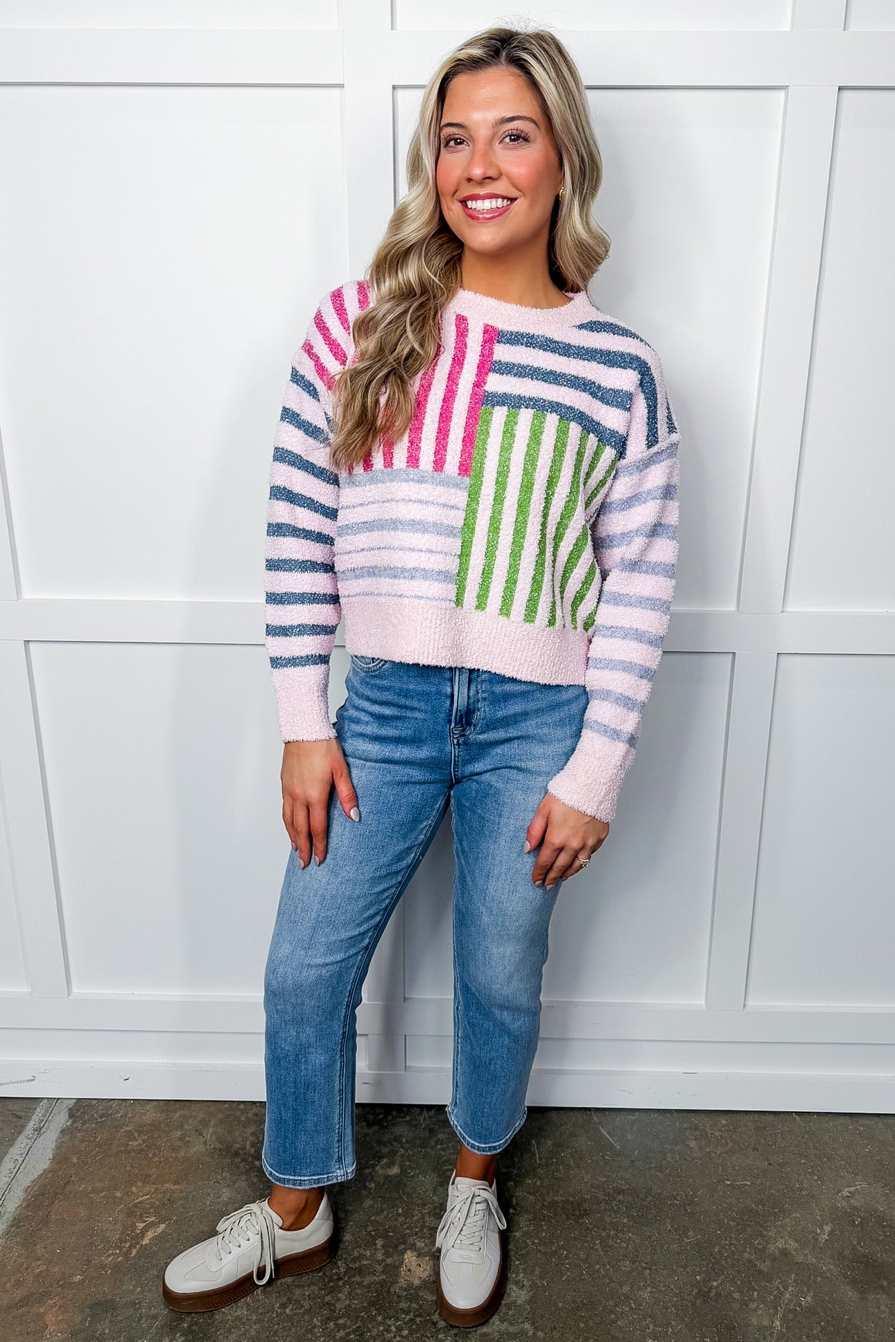 Bright, bold, and full of personality — this playful striped sweater is made for days when you want comfort and compliments. Featuring mixed-pattern color block stripes with a contrasting front pocket, it brings a fun pop of color to any outfit. Perfect with denim for a casual look, layered with a collared shirt for preppy chic, or pair with white jeans for a fresh weekend style. Soft, cozy, and easy to wear — your new happy-vibe sweater!