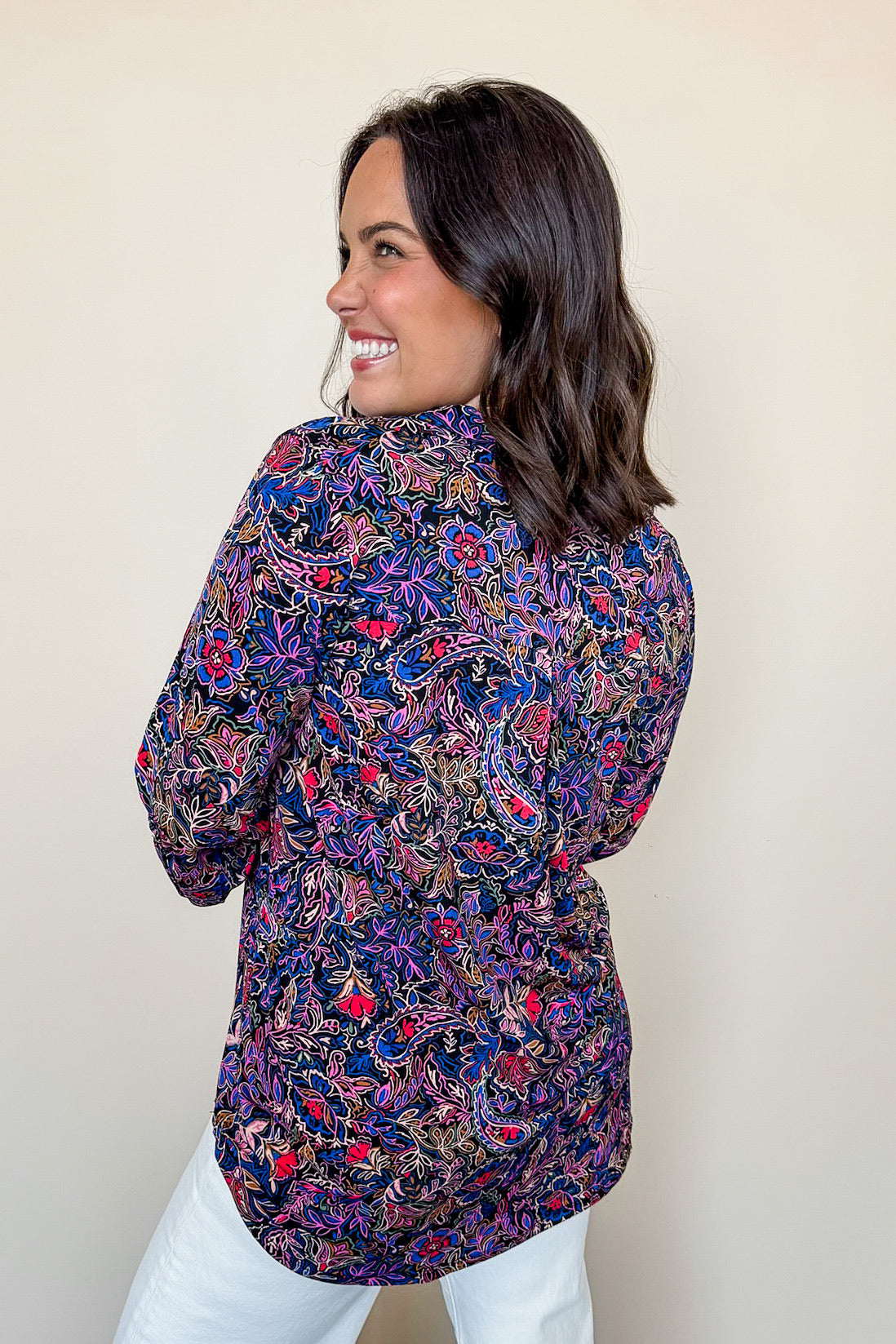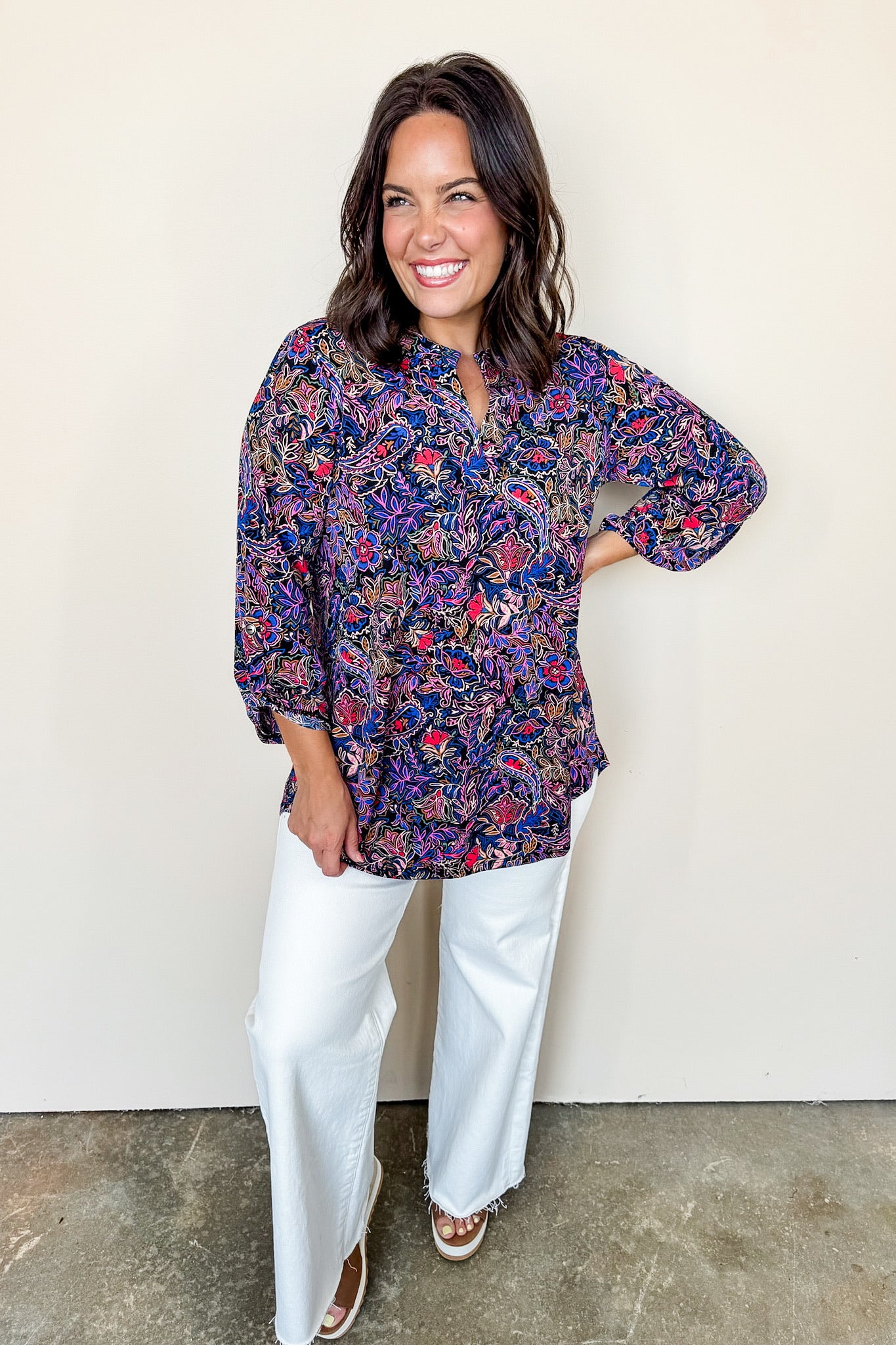 Brighten your wardrobe with the Dear Scarlett Lizzy Printed Top in Black. This best-selling floral print features a flattering V-neck and breezy 3/4 length sleeves, perfect for effortless style with a playful twist. Its vibrant design and comfortable fit make it an easy go-to for any casual outing or lively gathering.