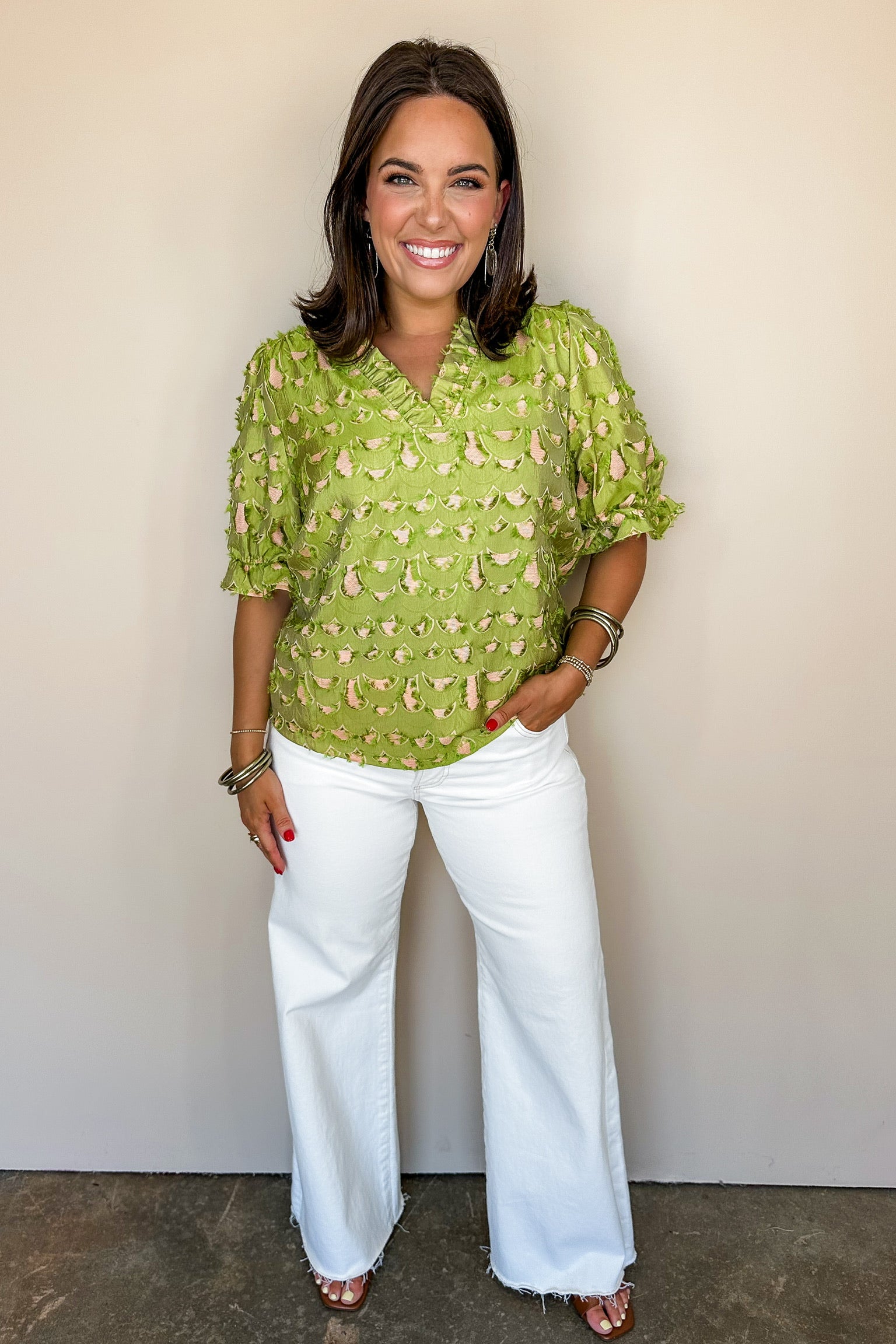 Elevate your wardrobe with this elegant green blouse featuring delicate pink frilly details. The sophisticated puffy sleeves and ruffle top create a graceful silhouette that cinches beautifully at the waist. Perfect for adding a refined touch to both casual and dressier looks.