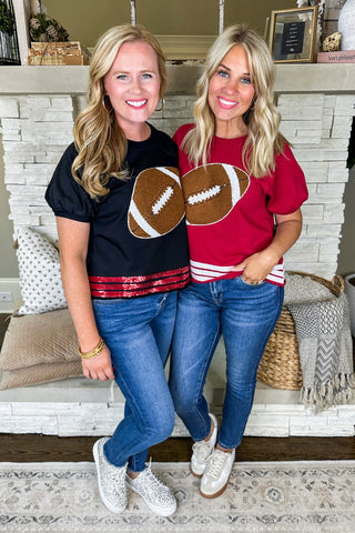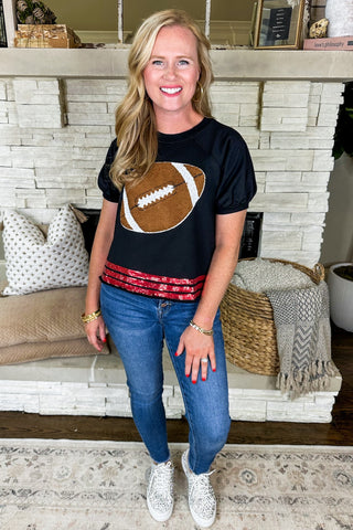 Elevate your game day style with our Textured Football Sequin Trim Game Day Top in Black. This premium top features intricate textured details and sparkling sequin trim, adding a touch of luxury to your football fandom. Show off your sophisticated side while cheering on your team in style.