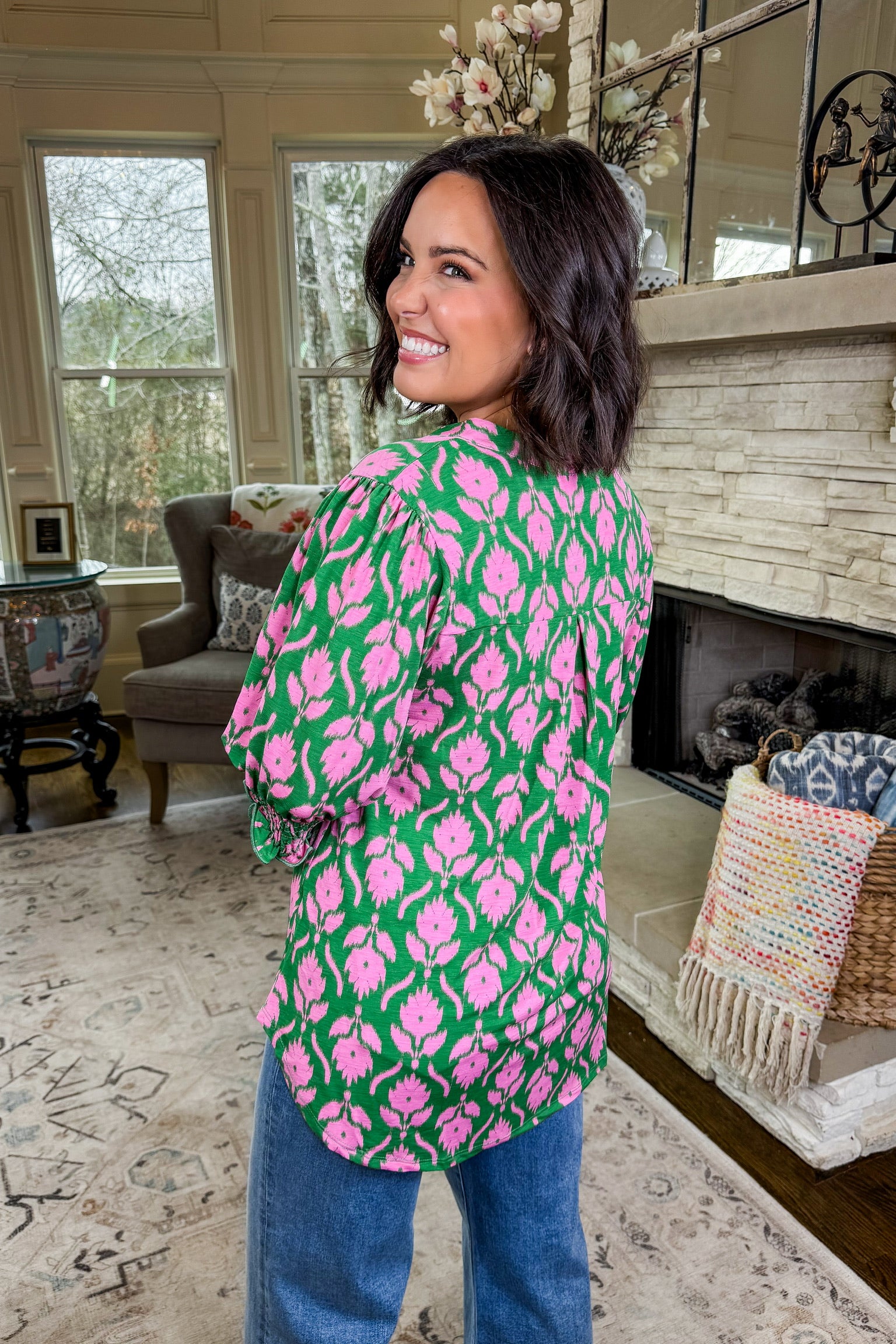 The Lizzy Smocked Short Sleeve Top in Green/Pink Floral