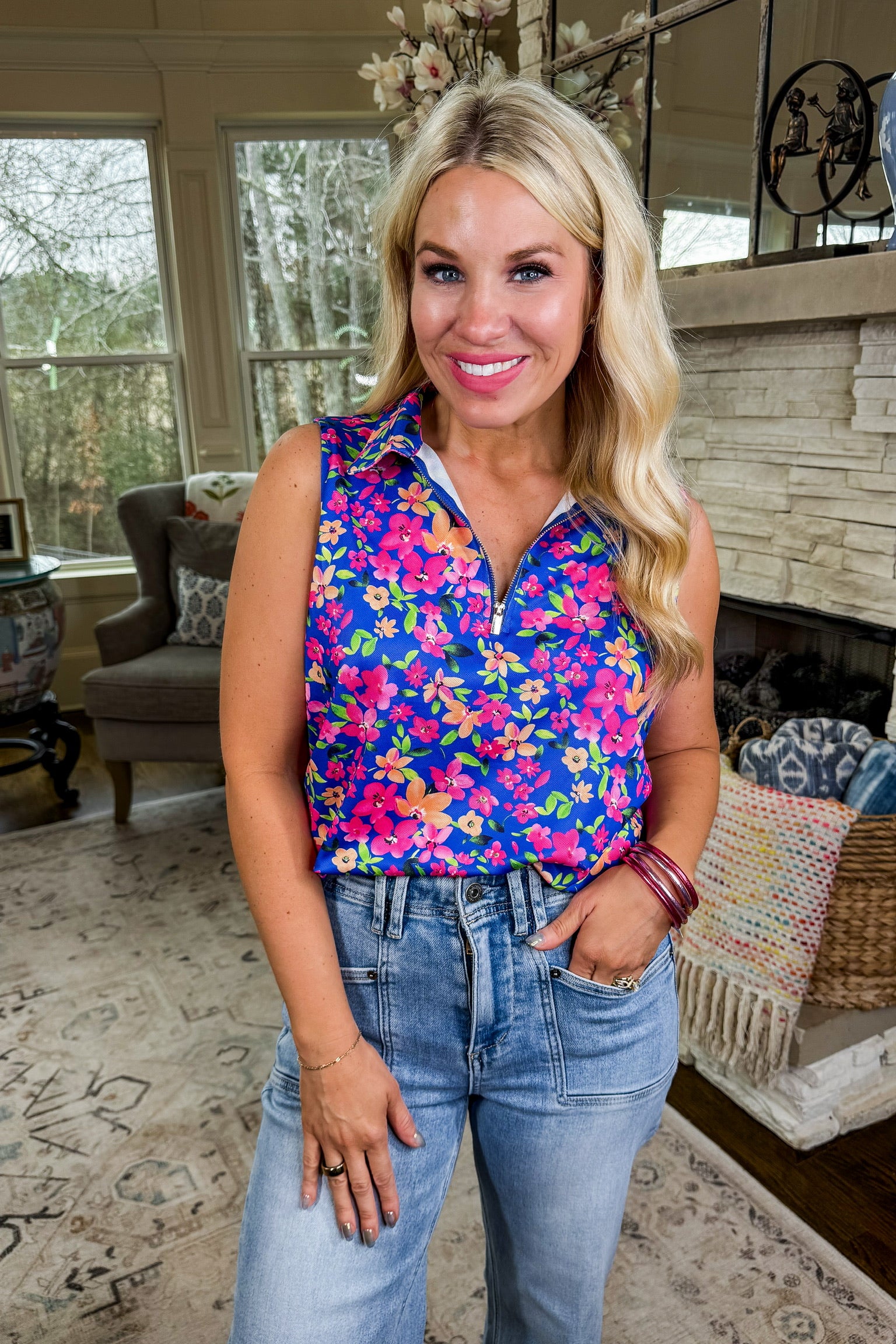 The Sun Dial Quarter Zip Tank in Blue Multi Floral