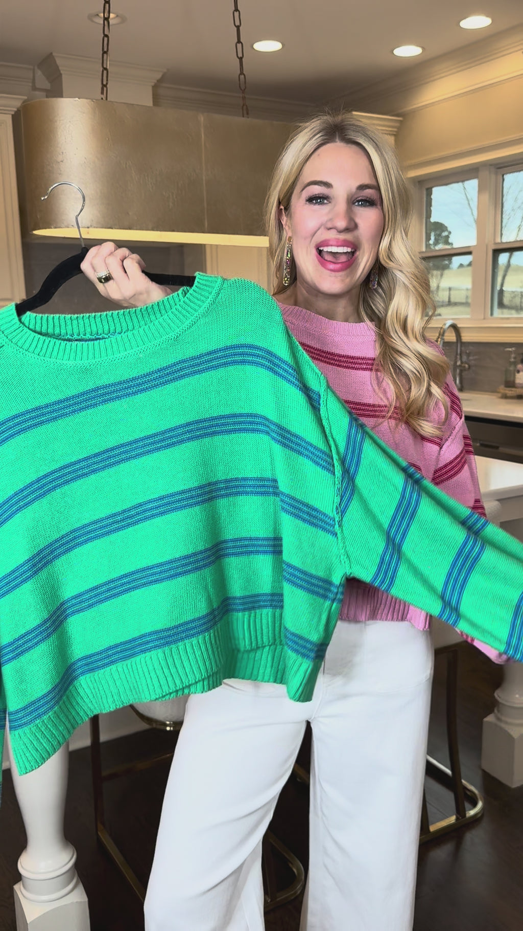 Cozy up in this playful pink and magenta sweater that's got all the right moves. The relaxed silhouette keeps things breezy, while the slightly cropped length adds a modern twist. Long sleeves and a classic round neck provide timeless comfort, and those striped details bring just enough visual interest to keep things fun. Finished with ribbed cuffs and hem for a polished touch that actually stays put.