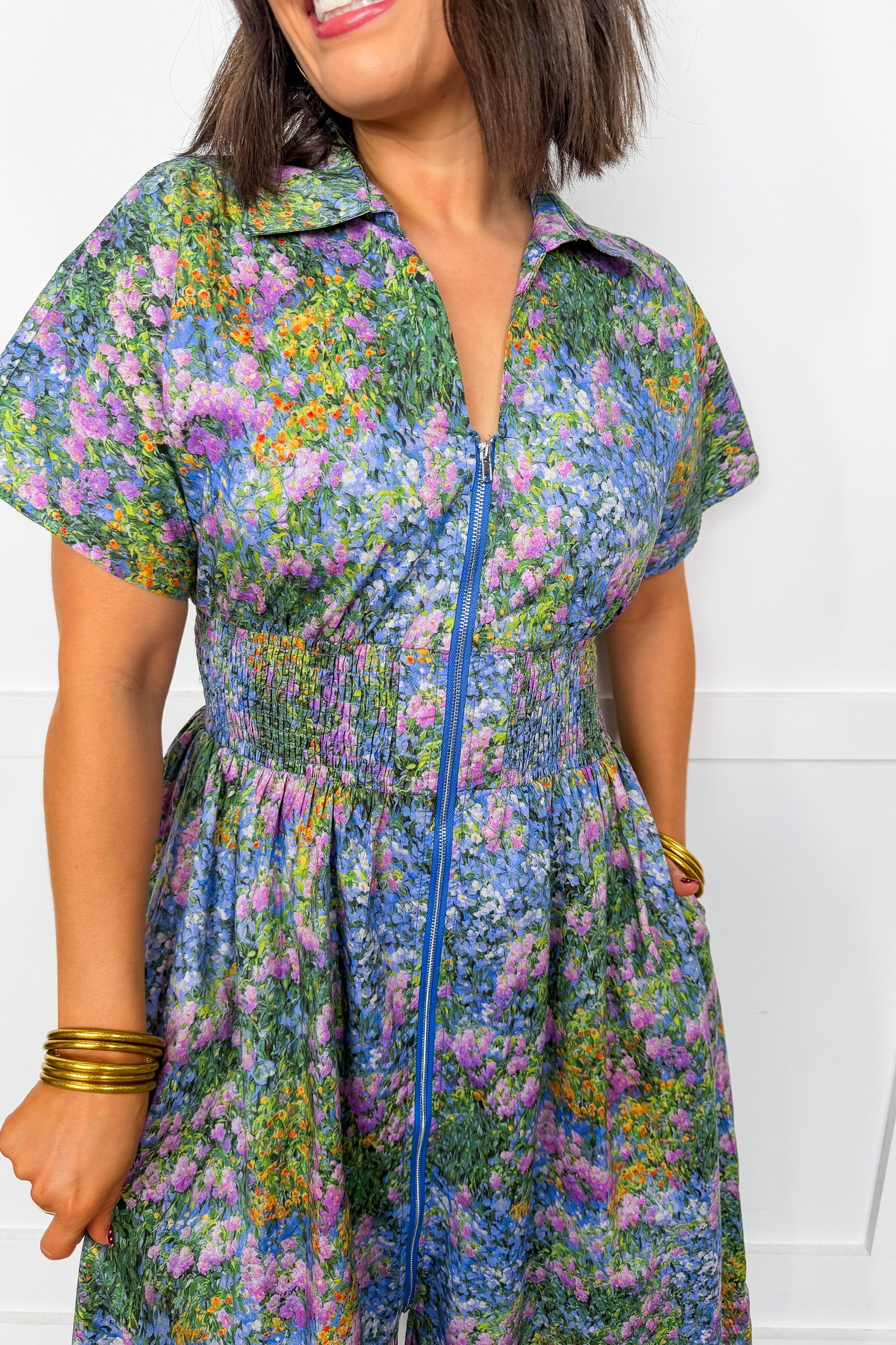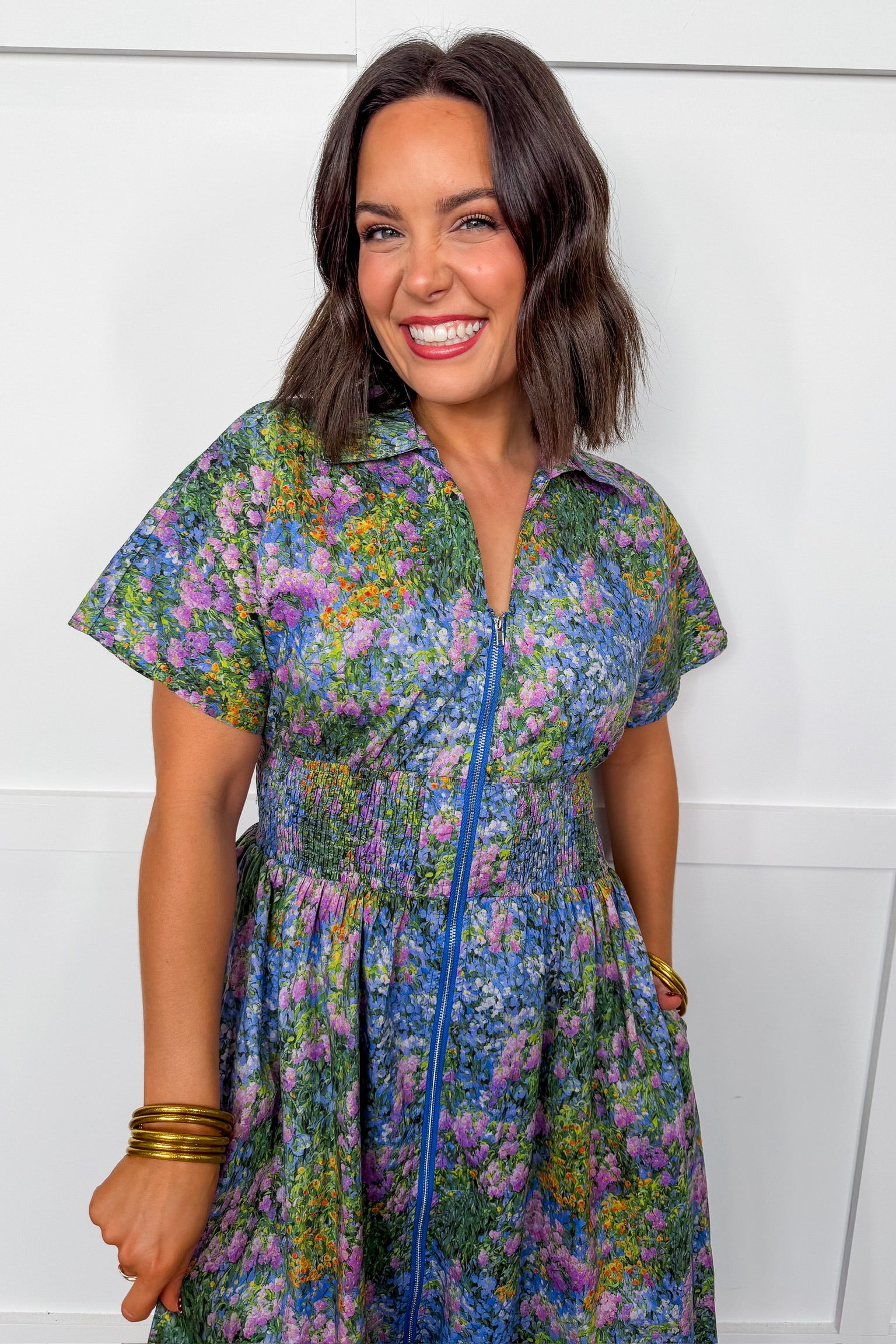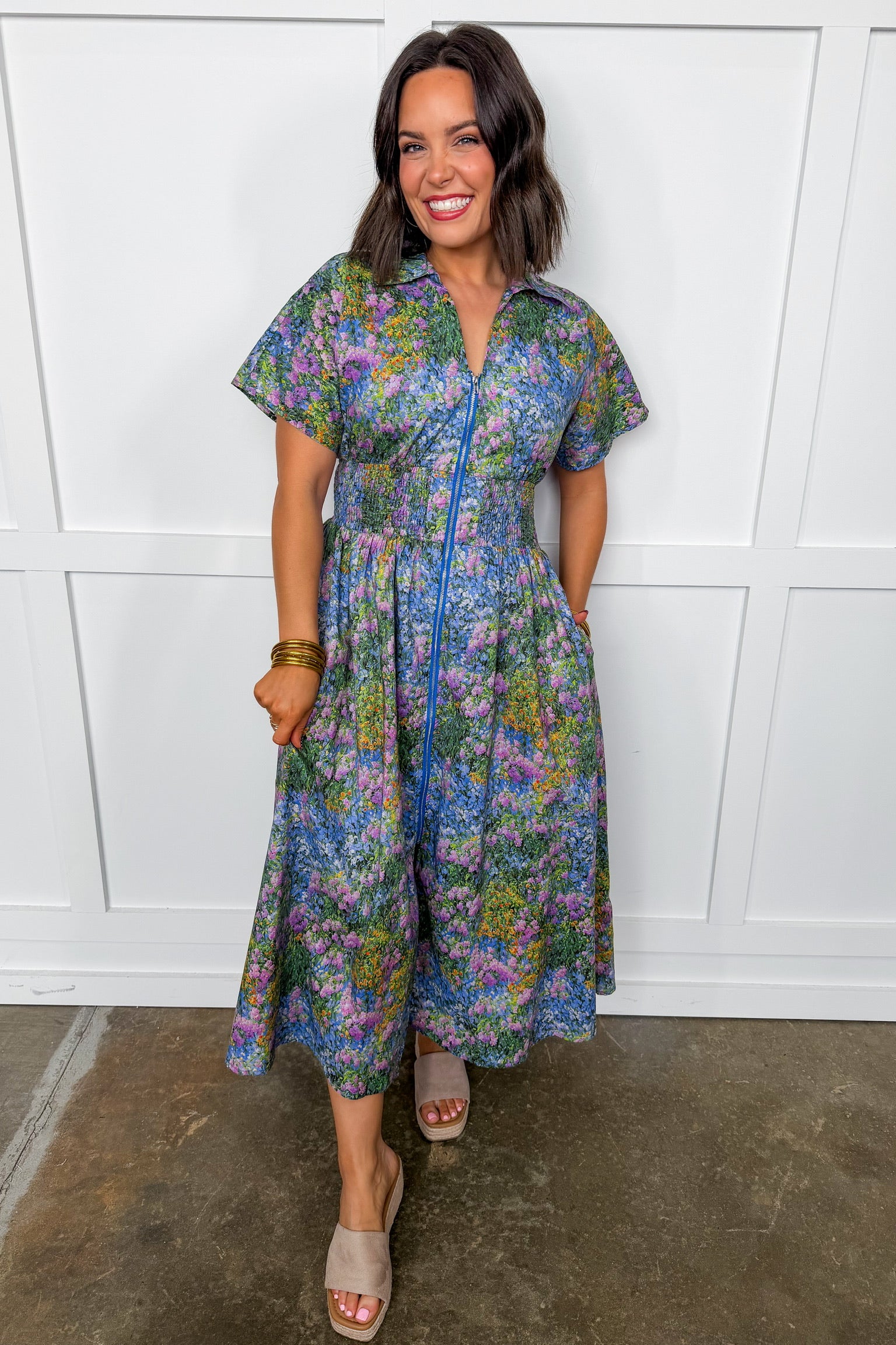 A true customer favorite, the Best Selling Krissy Zip-Up Midi Dress in Blue Floral is loved for its flattering fit and effortless style. Designed in a soft blue floral print, this midi dress features a functional zip-up front and a gently cinched waist that creates the perfect shape without feeling restrictive. The classic collar and short sleeves keep it polished, while the flowy skirt makes it easy to wear from day to night. Once you try this silhouette, you’ll understand why it’s one of our most popular styles.
