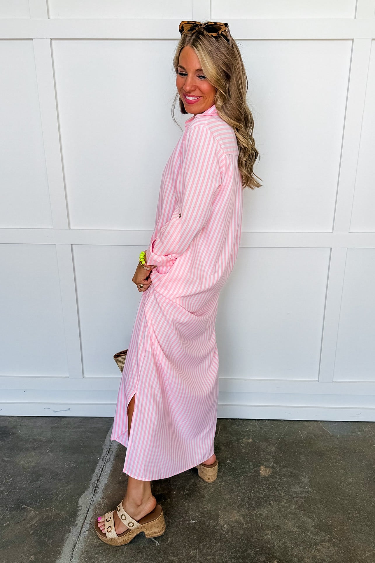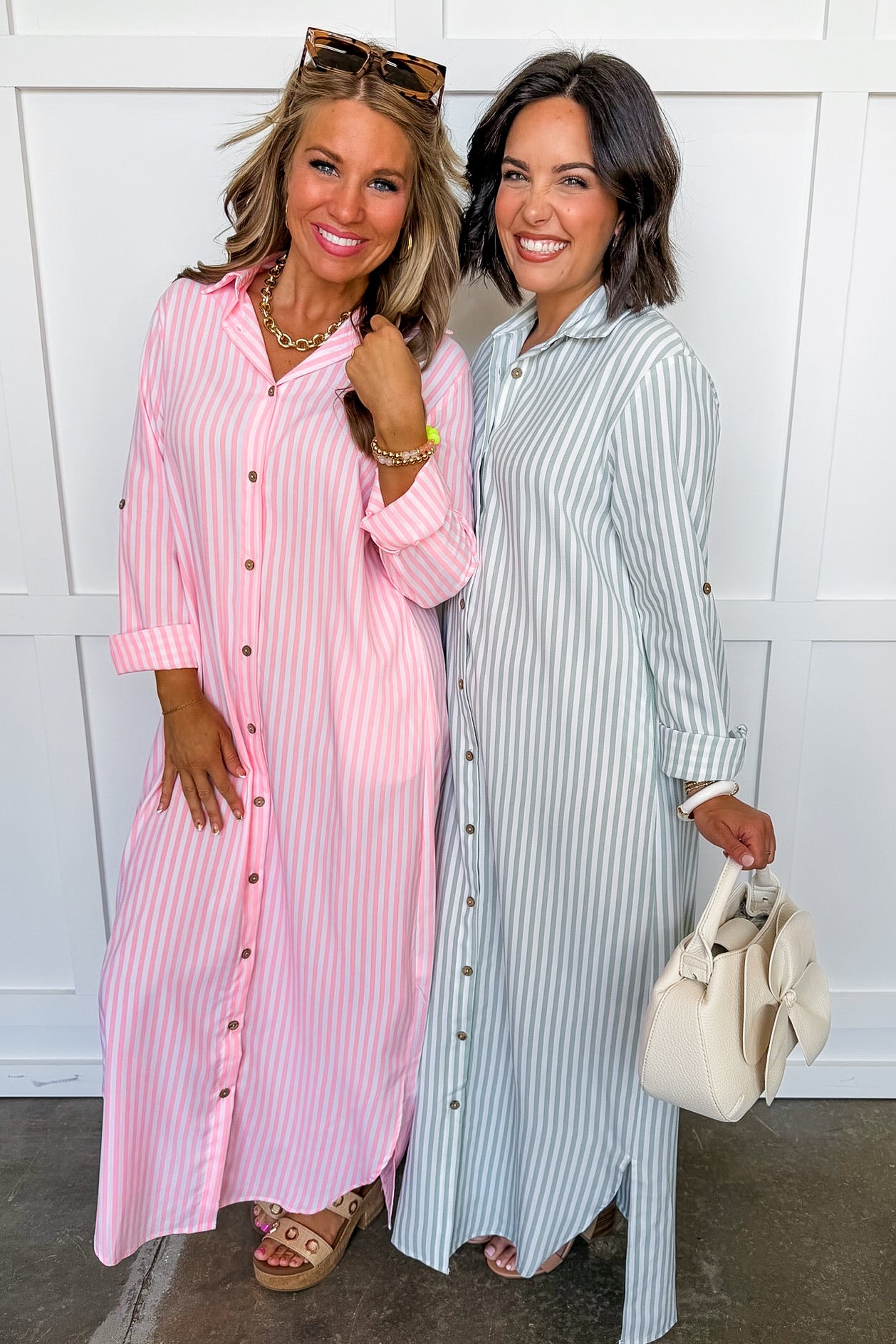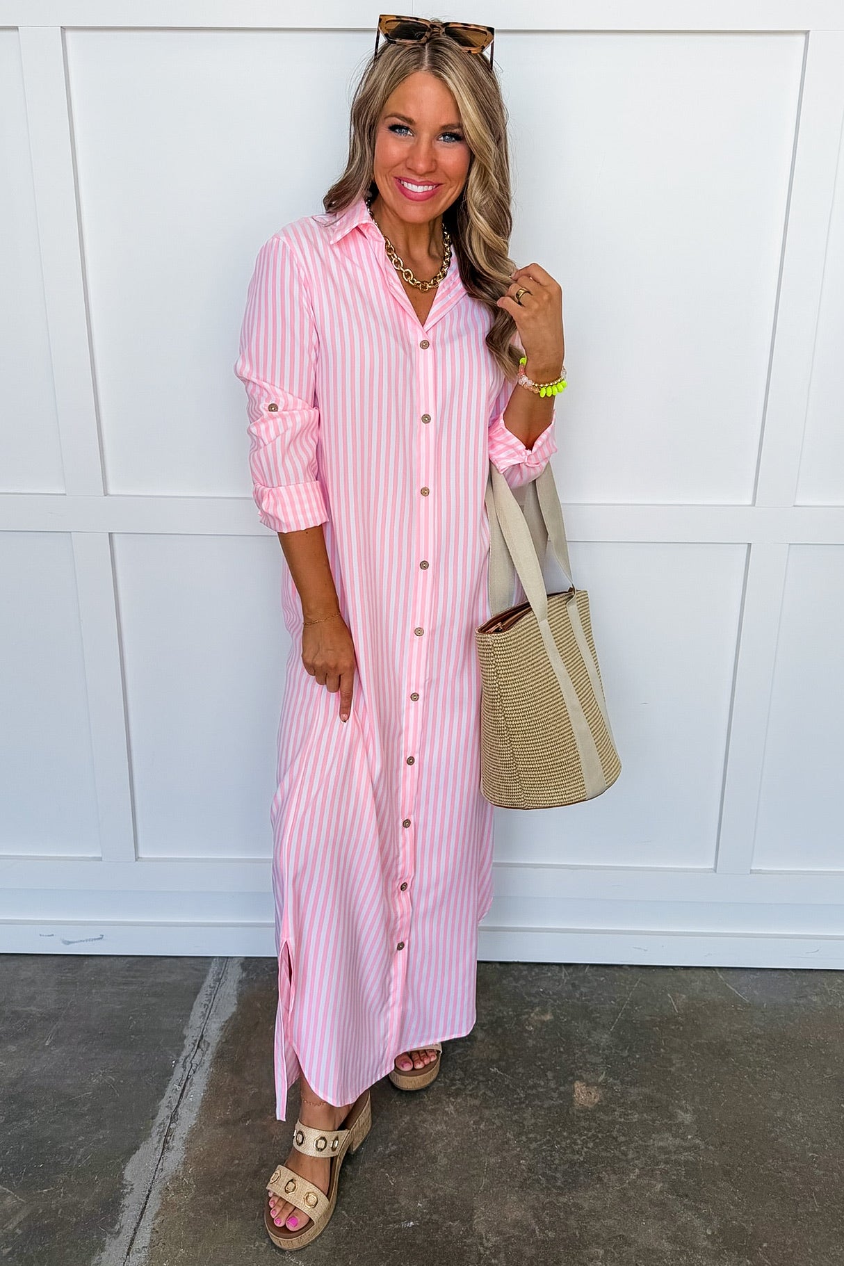 The Out & About Stripe Midi Dress is the definition of effortless style. Designed with a relaxed, flowy silhouette and classic stripe pattern, this button-front dress is perfect for easy, everyday wear. The lightweight fabric keeps it breathable and comfortable, while the collared neckline and rolled sleeves add a polished touch. Whether you're running errands, heading to brunch, or traveling, this versatile piece is one you’ll reach for again and again. Available in multiple colors to fit every mood and season.
