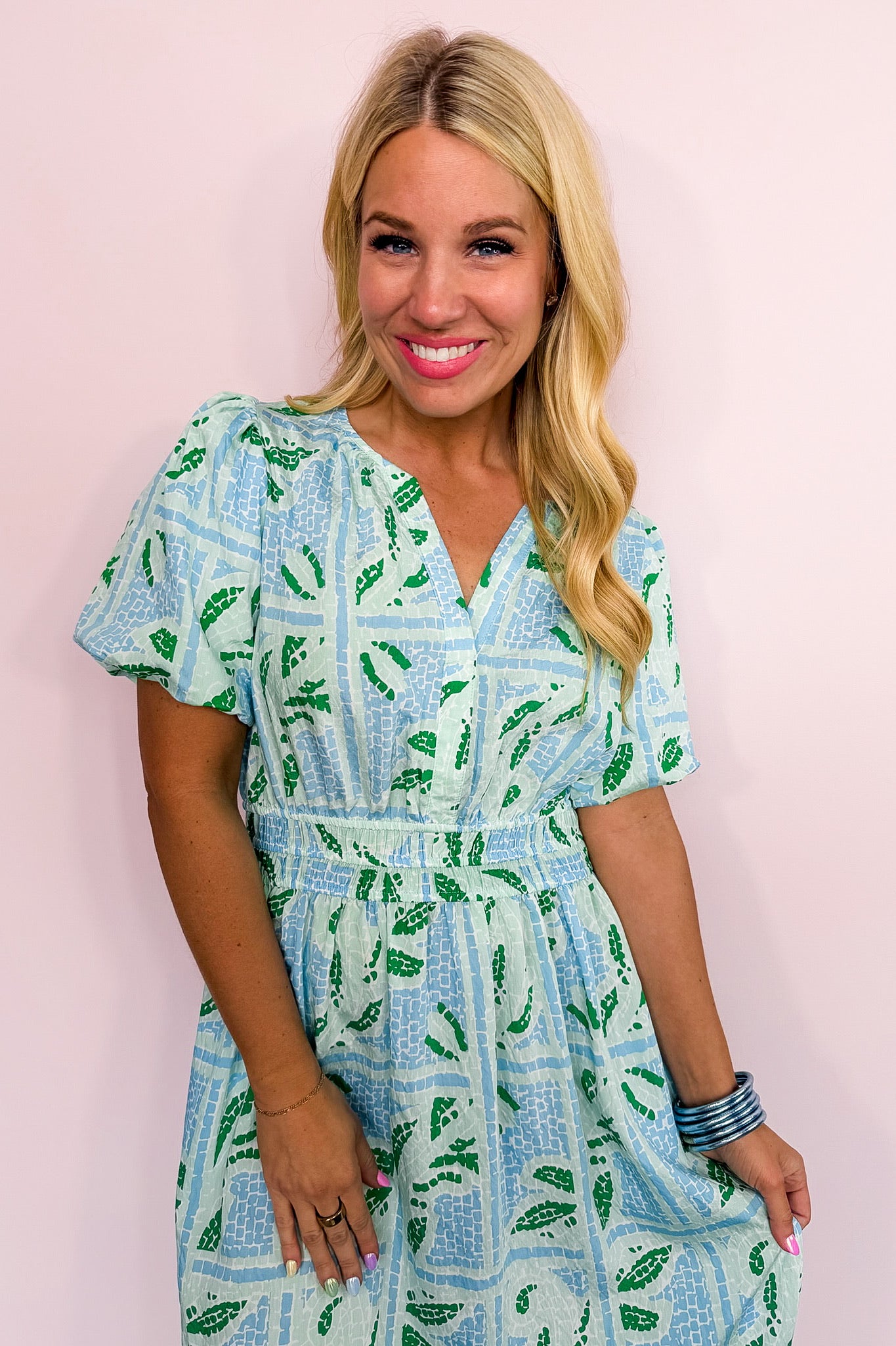 Light, airy, and effortlessly elegant, this dress is made for sunny days and special moments alike. Designed with soft puff sleeves, a flattering cinched waist, and flowing tiered skirt, this dress moves beautifully with every step. The delicate blue print adds a fresh, romantic touch that’s perfect for spring celebrations, brunch dates, or family gatherings.