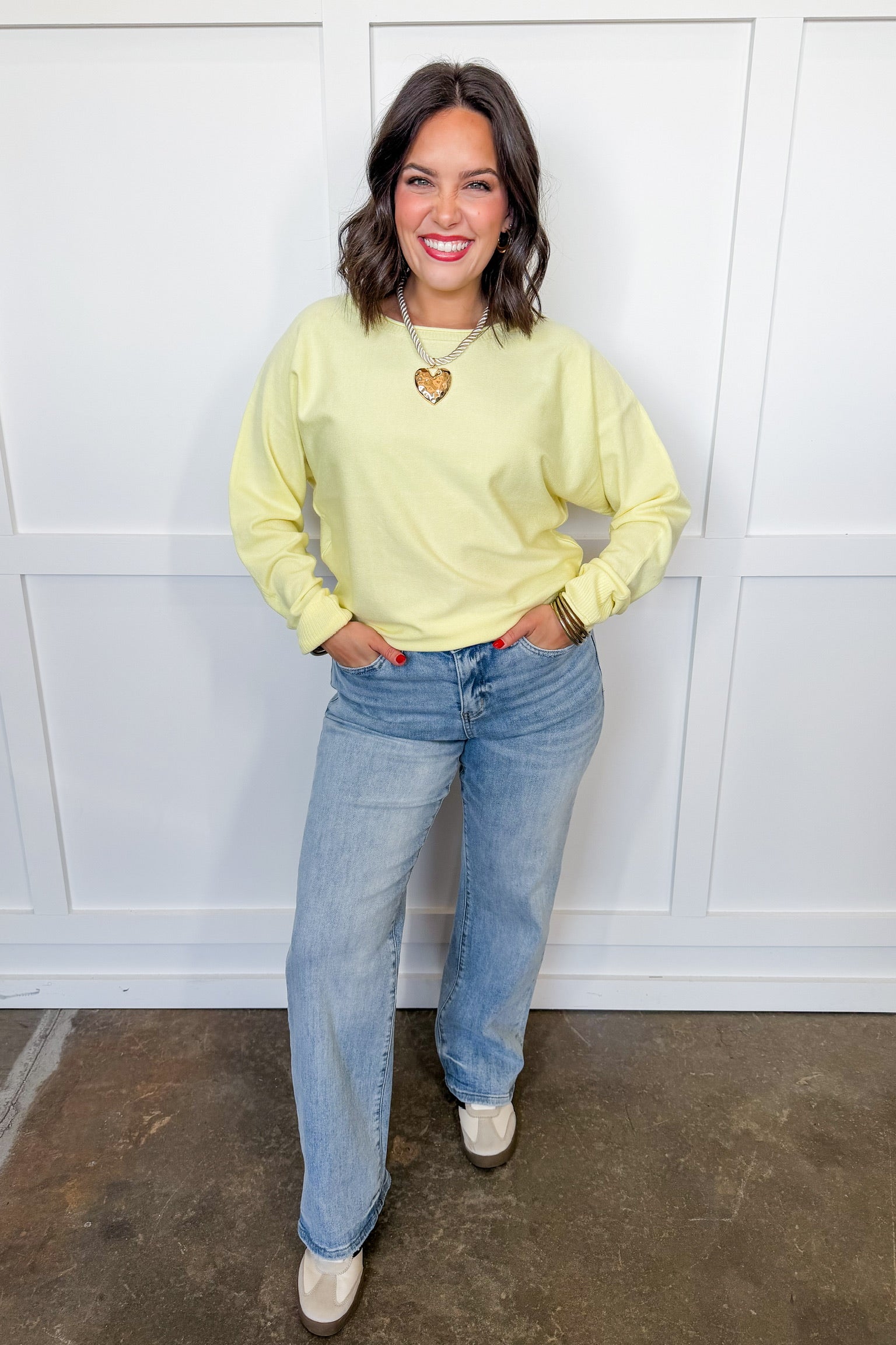 Meet your new sunshine staple! The Everyday Crewneck is the perfect blend of cozy comfort and effortless style. This soft, lightweight sweatshirt features a relaxed silhouette that pairs beautifully with jeans, leggings, or biker shorts for easy everyday outfits. Its fresh pastel adds the sweetest pop of color to your wardrobe—perfect for spring, summer, and beyond. Whether you're running errands, lounging at home, or styling for a casual day out, this crewneck keeps you comfy and cute.
