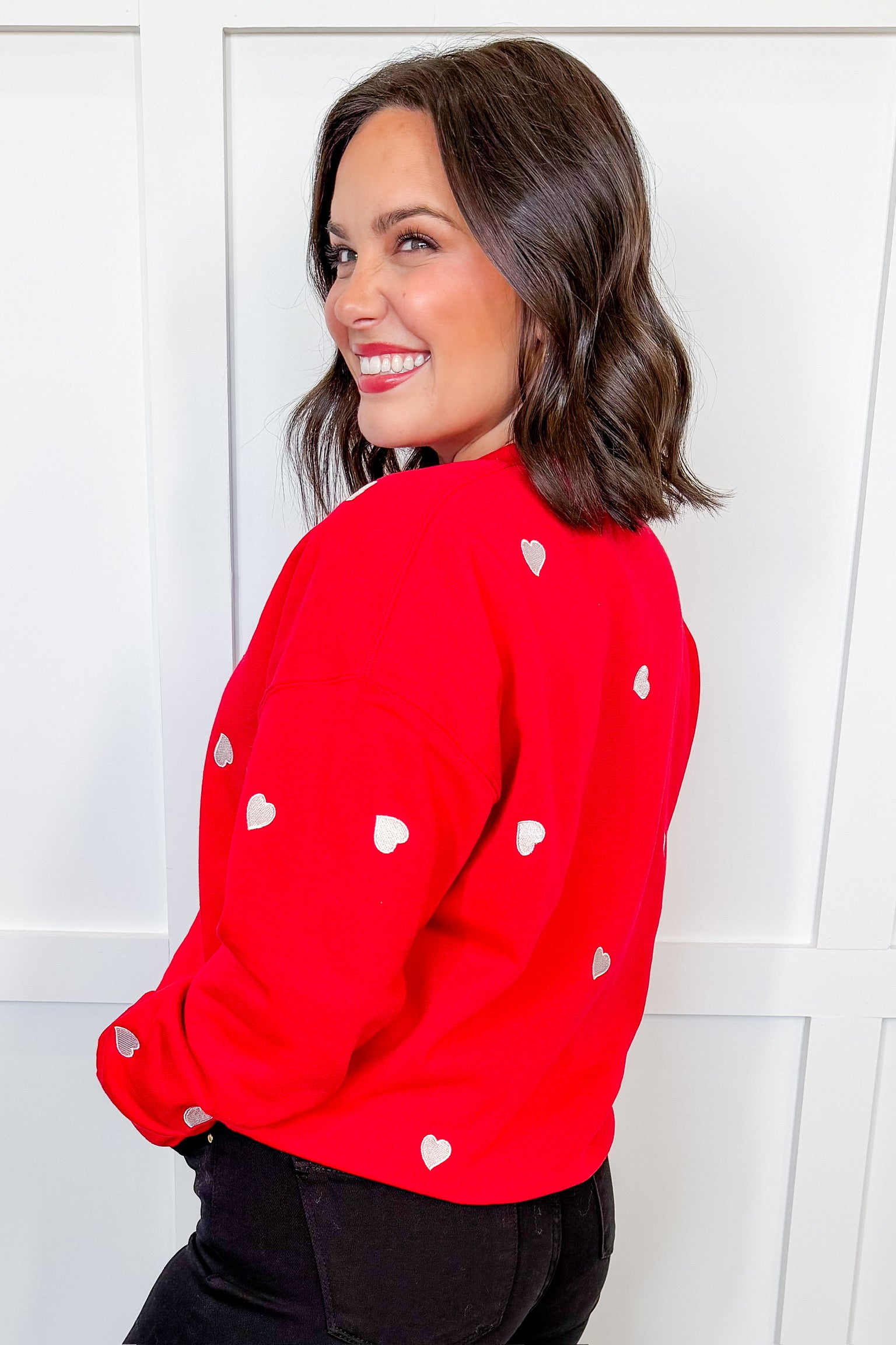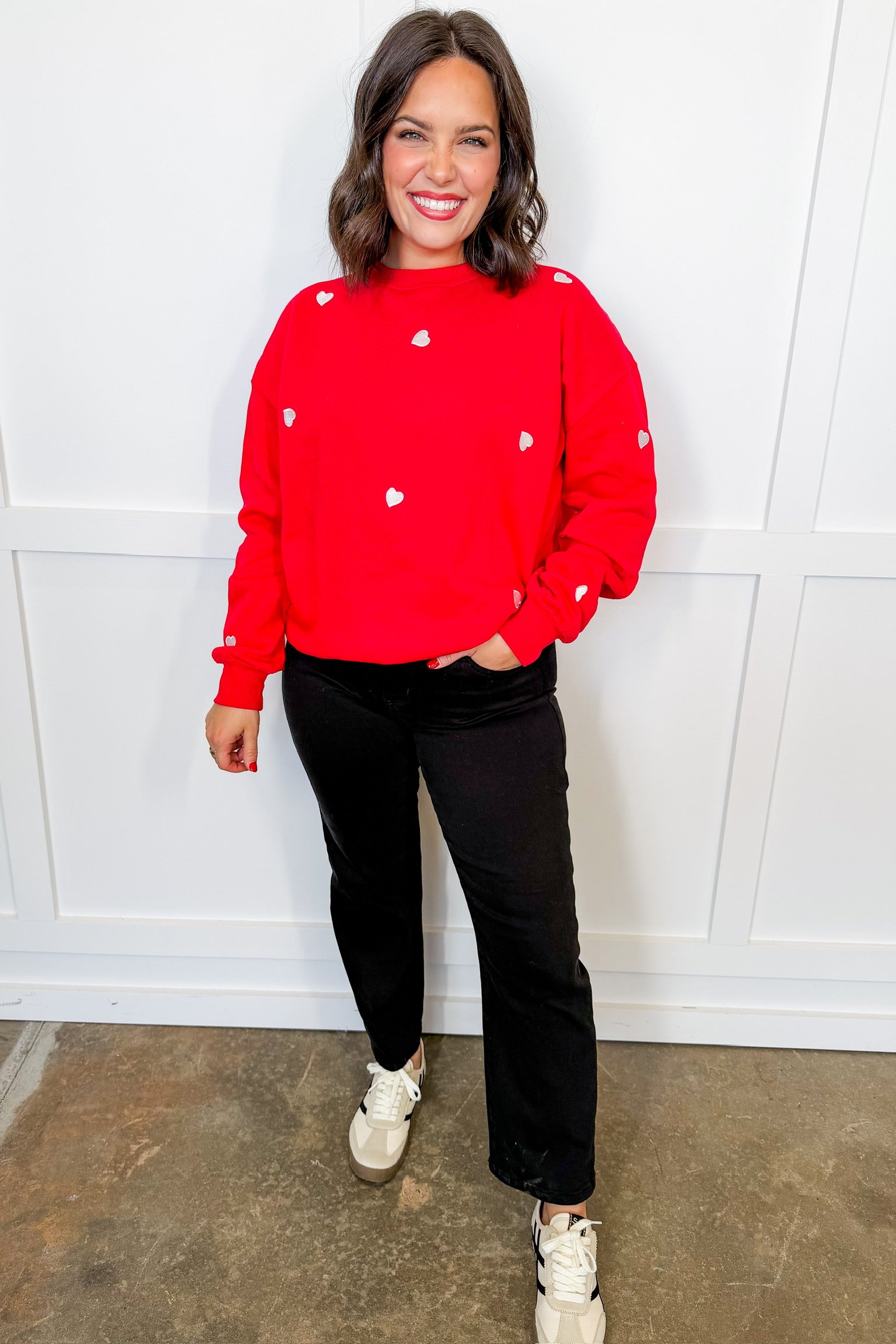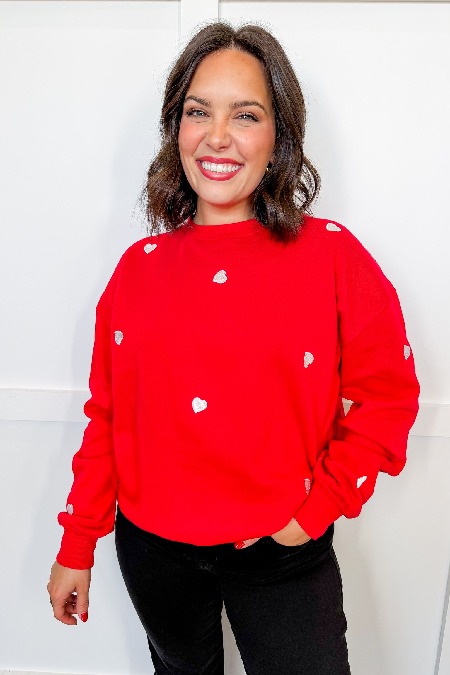 Fall in love with this adorable embroidered heart crewneck — the perfect mix of cozy and cute! Featuring tiny hearts sprinkled across the front and sleeves, this sweatshirt brings the sweetest subtle Valentine vibes without being over the top.