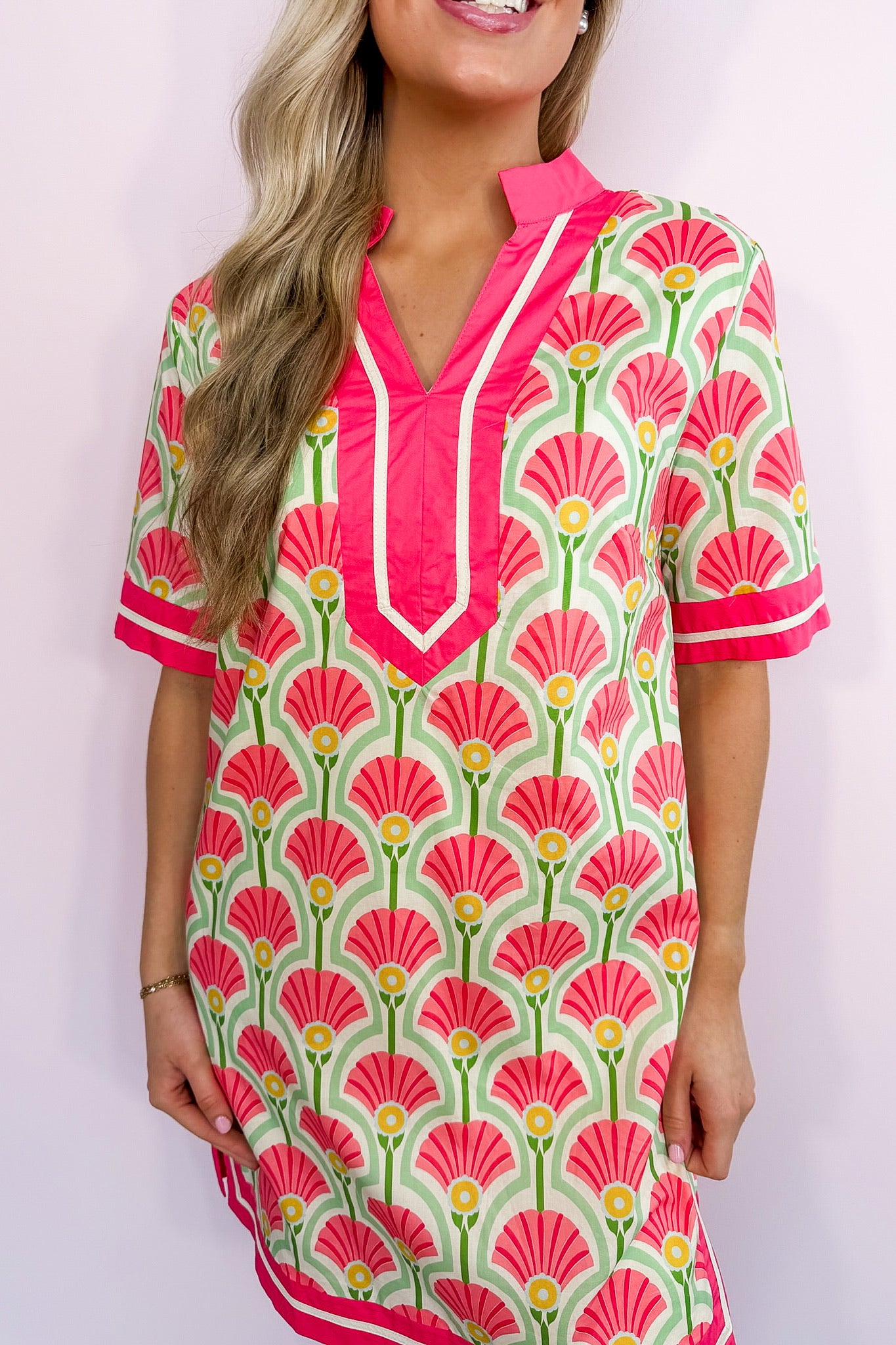 Chic, polished, and full of personality — The Riviera Bloom Mini Dress is your new statement-maker. Featuring a bold fan-inspired print with contrast trim detailing along the neckline, sleeves, and hem, this dress blends timeless tailoring with playful color. The structured split neckline and easy shift silhouette create a flattering, effortless fit, while the mini length keeps it fresh and modern. Pair it with wedges for brunch, sneakers for daytime errands, or heels for a polished event look.