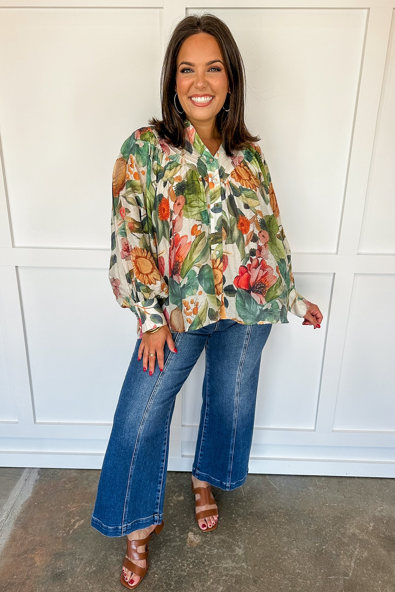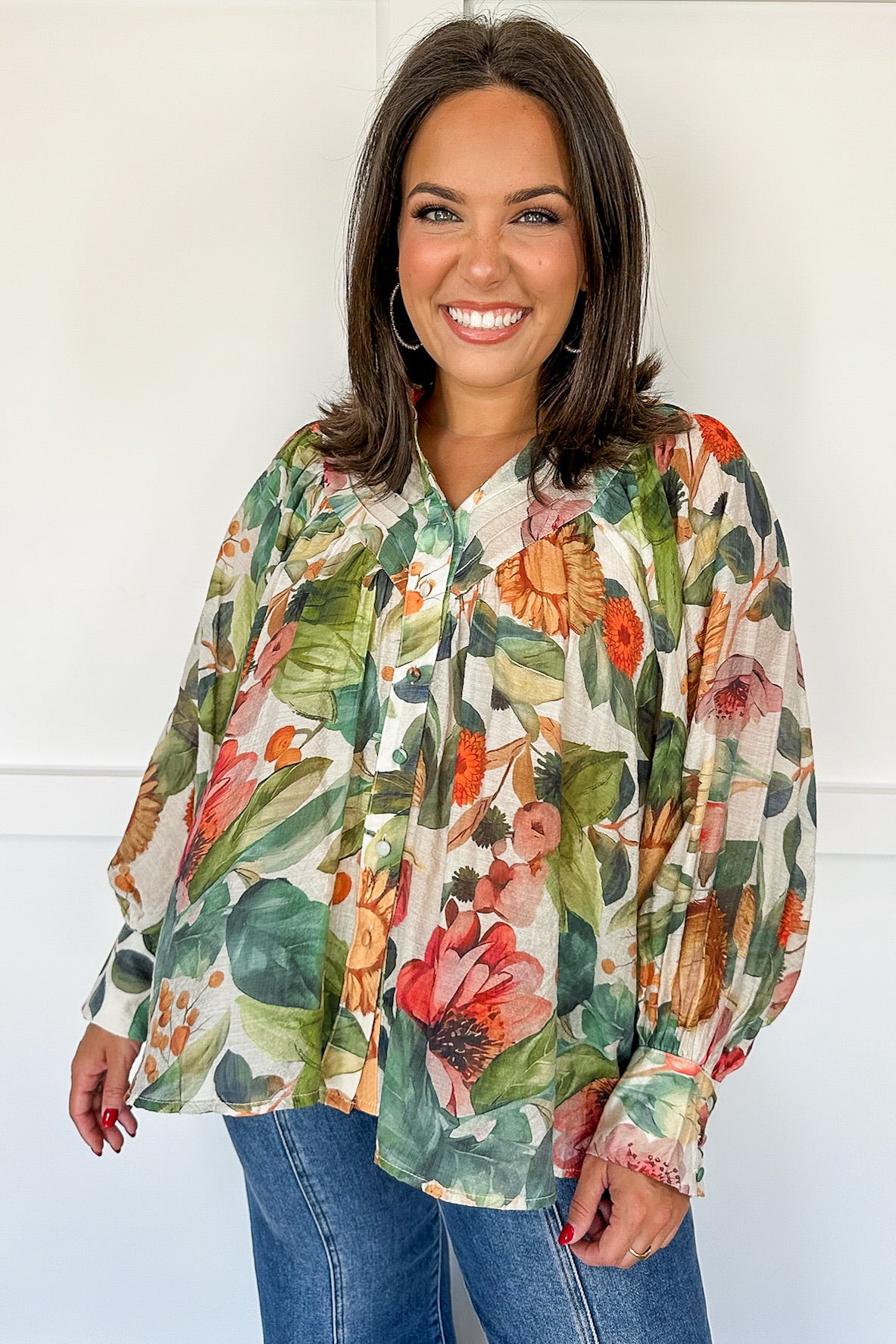 Embrace breezy elegance with the Forest Bloom Billowy Colorful Blouse. Its button-down front and long sleeves create a classic yet effortless look, while the multi-colored print adds a fun burst of color. Designed to hit just below the waist, this blouse flatters every bust with its flowy, comfortable fit—perfect for playful days and lively evenings alike.