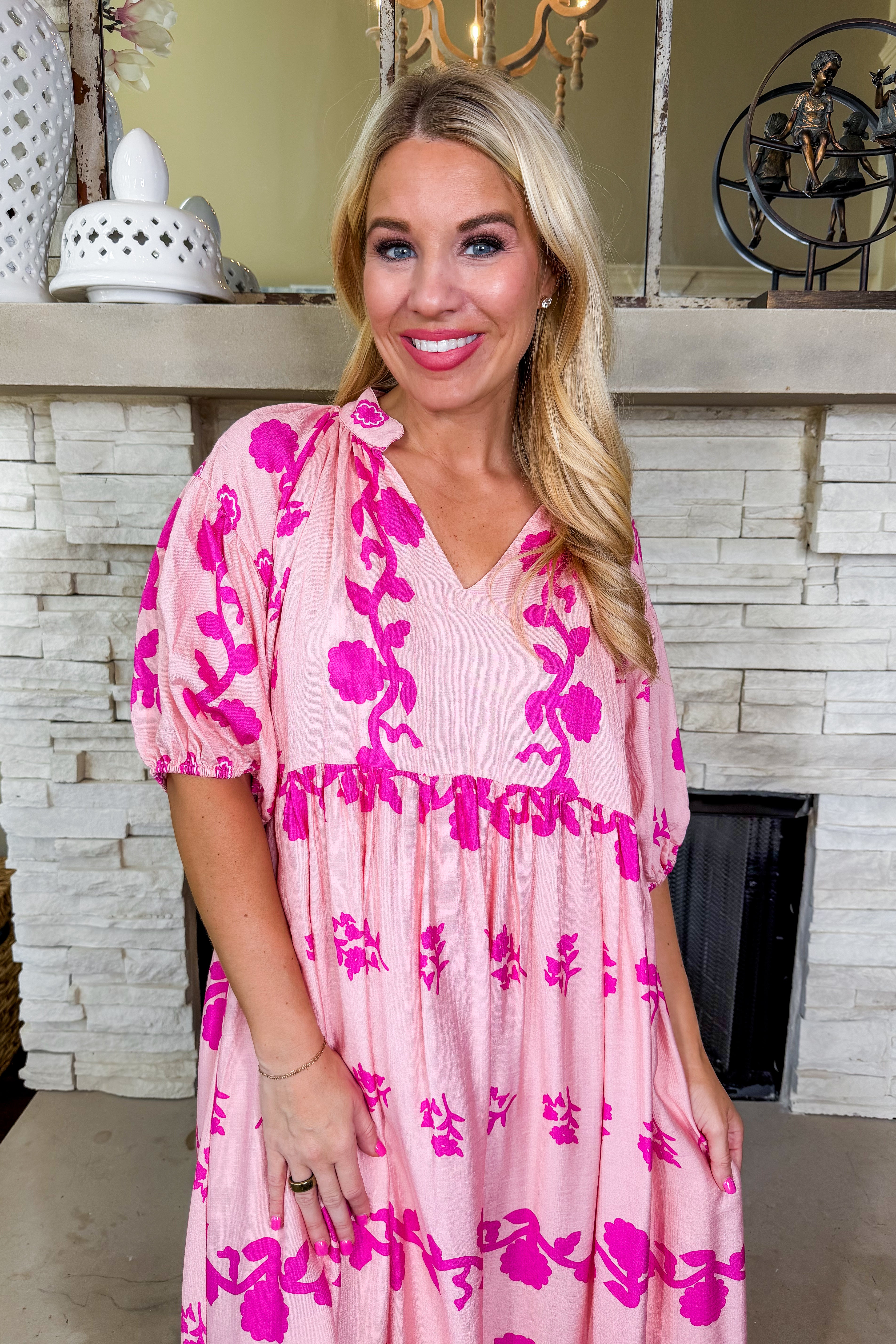 The Blush Meadow Tiered Dress is effortlessly romantic with its soft pink hue and bold floral print. Designed with a relaxed silhouette, flattering tiered seams, and flowy long sleeves, this dress is as comfortable as it is eye-catching. Lightweight and airy, it’s perfect for brunch dates, spring events, baby showers, or simply feeling pretty on an everyday outing.
