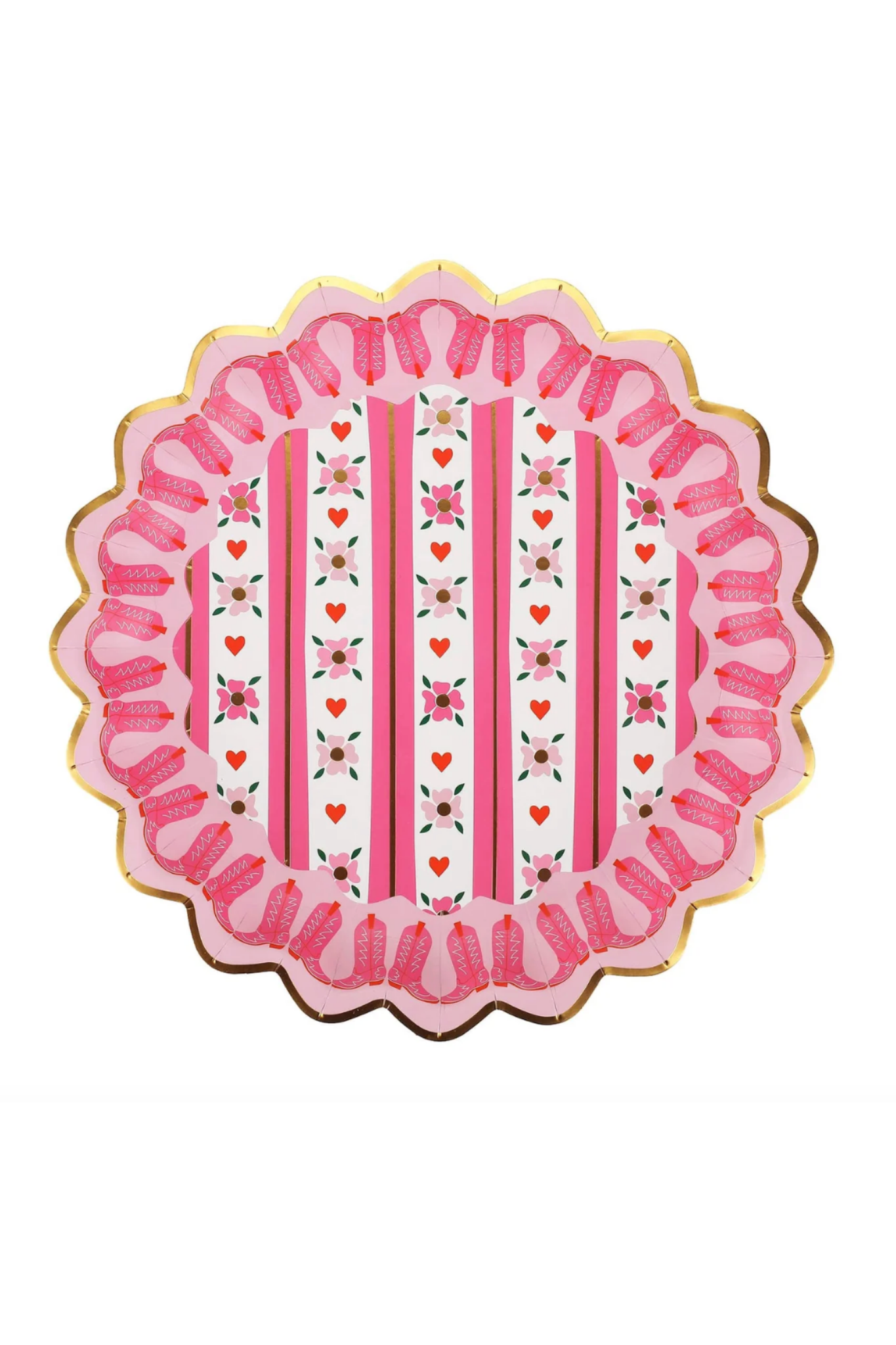 Set the table in standout style with these cowgirl scalloped dinner plates! Designed with a playful striped floral print and sweet cowgirl boot details along the scalloped edges, these plates are finished with shimmering gold foil trim for an elevated touch. Crafted from high-quality, durable paper, they’re perfect for serving meals while keeping your western-themed celebration effortlessly chic!