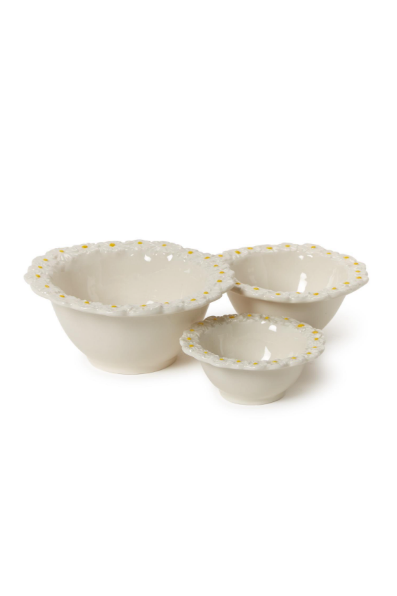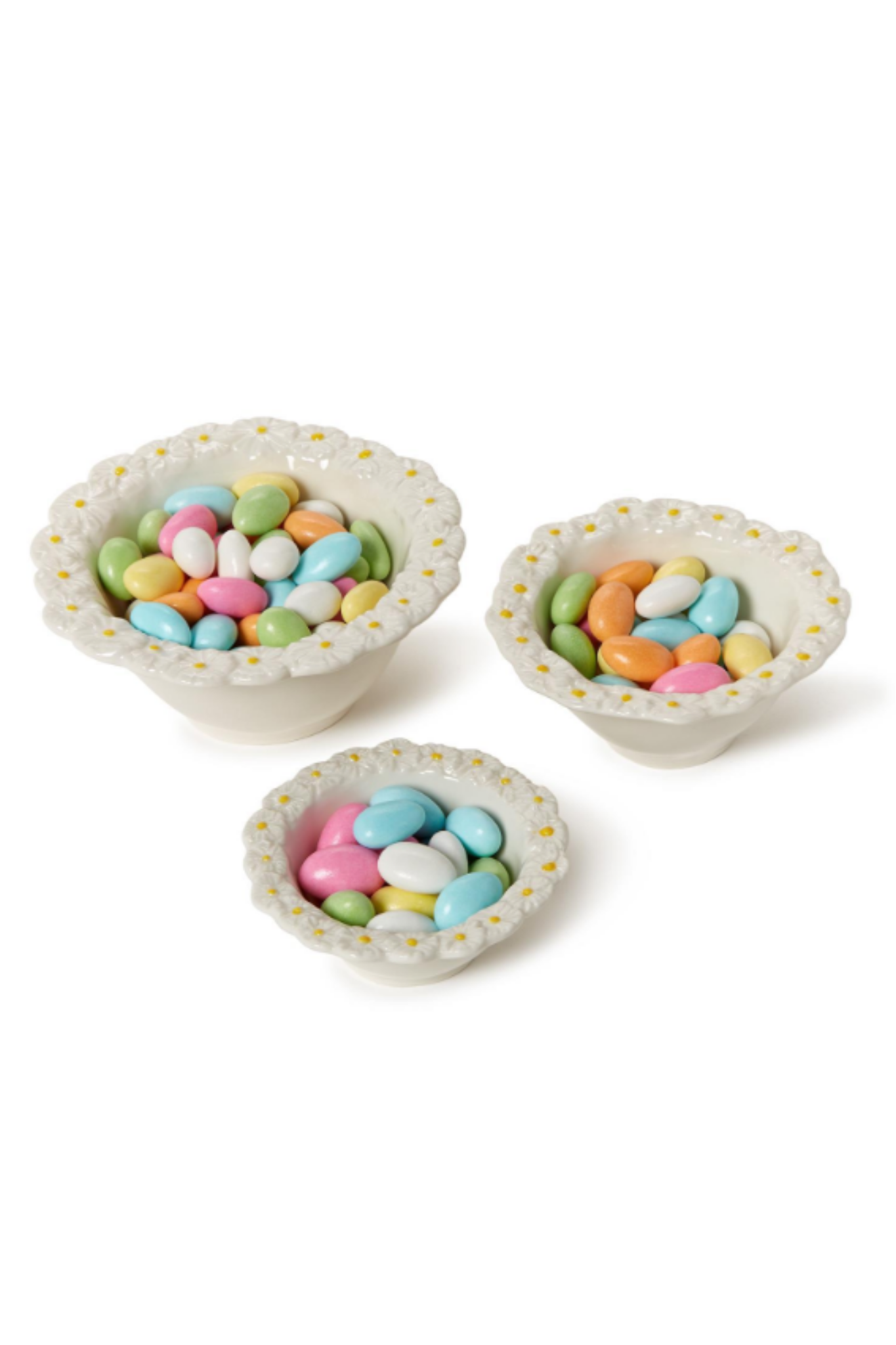 Sweet, charming, and perfect for spring entertaining, the Daisy Serving Bowl Set adds a playful touch to any table. Featuring a delicate scalloped edge with hand-painted daisy details, these bowls are ideal for candies, nuts, dips, or seasonal treats.