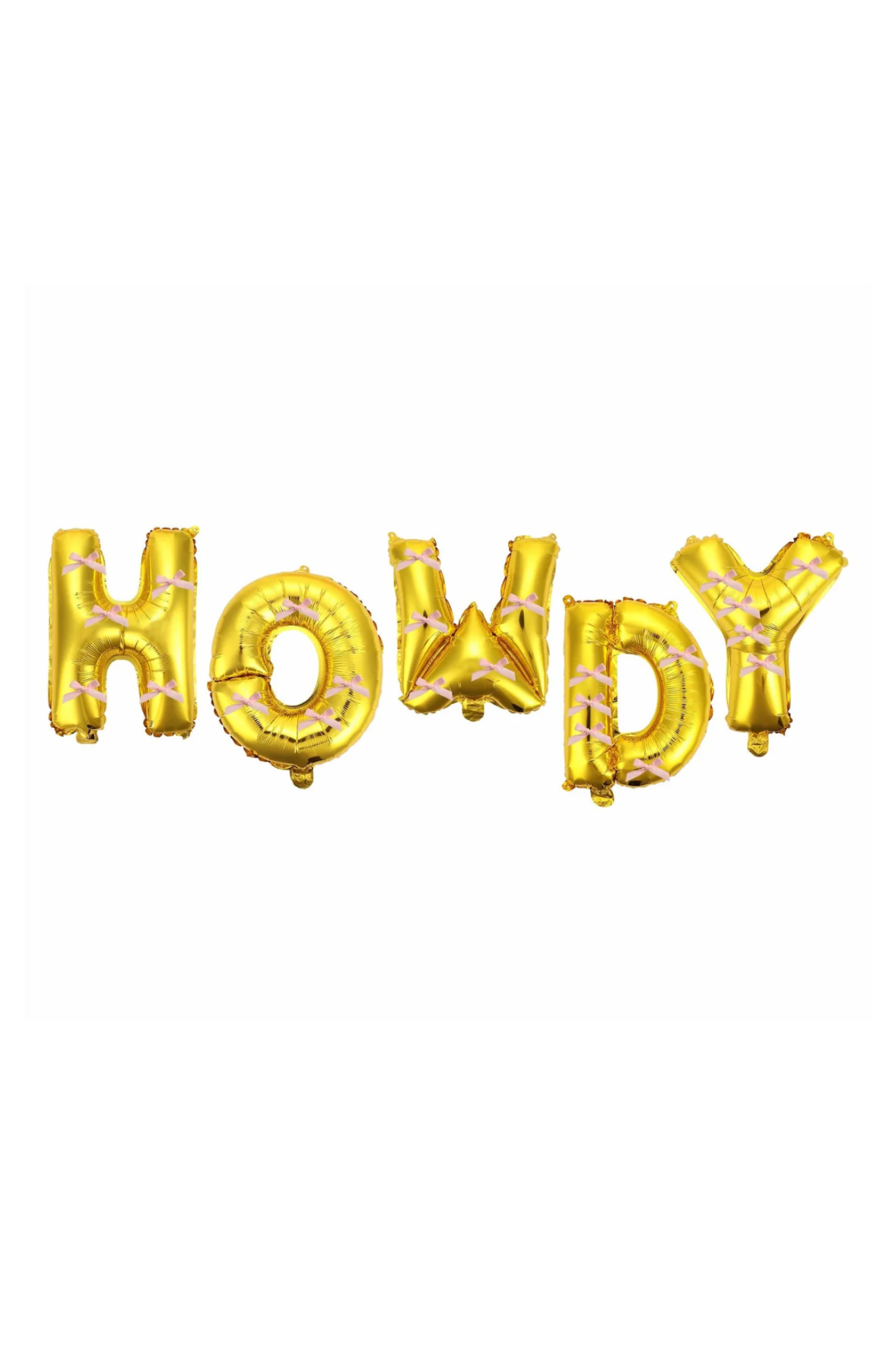 Make a statement at your celebration with this Howdy balloon banner! Featuring shiny gold letter balloons accented with sweet pink bows, this playful design adds the perfect mix of western charm and girly flair. Ideal for birthdays, western-themed parties, or statement photo backdrops, this balloon banner instantly elevates your party setup!