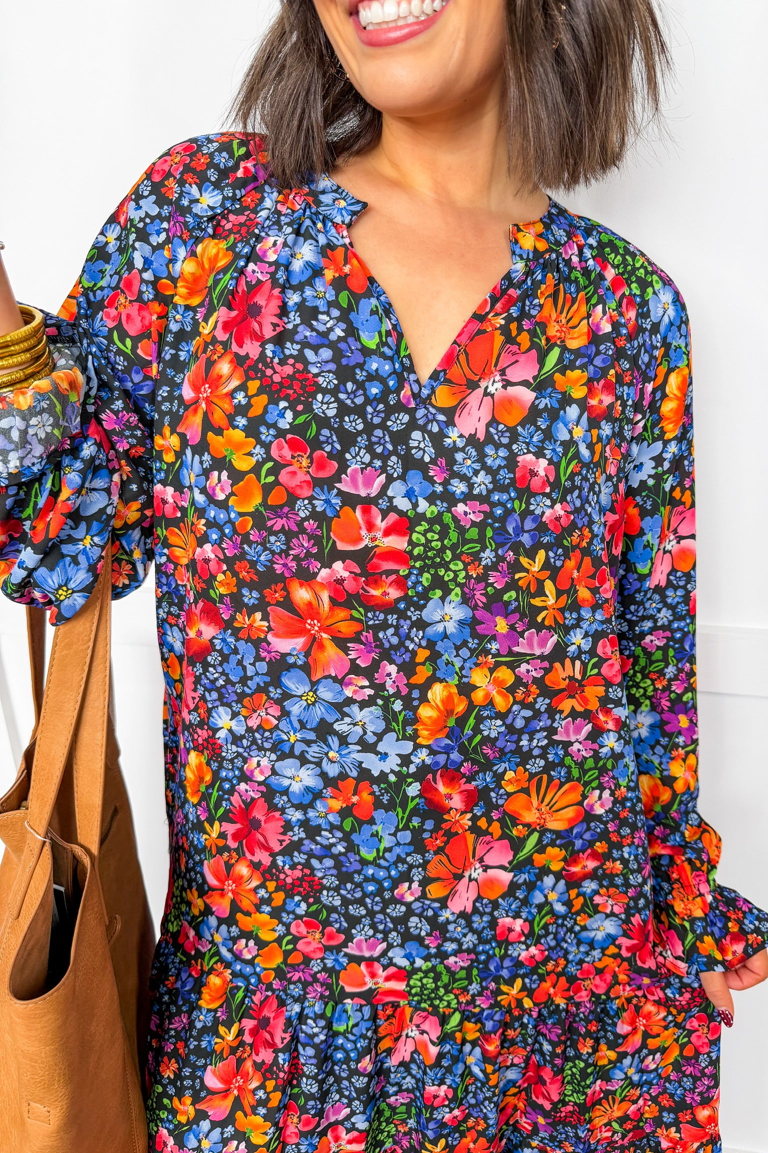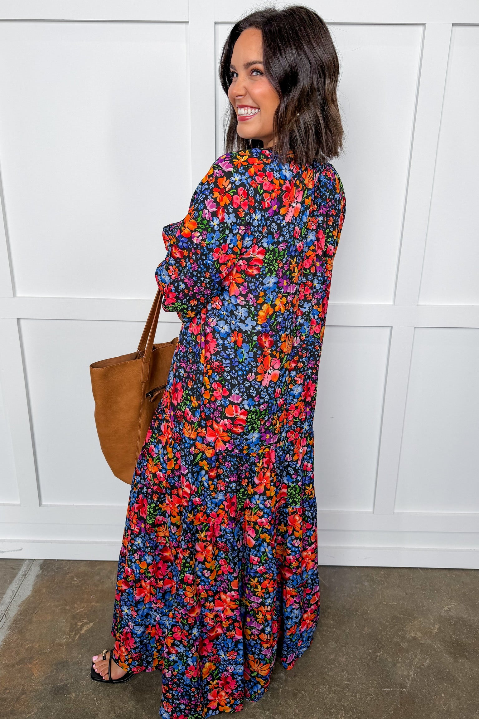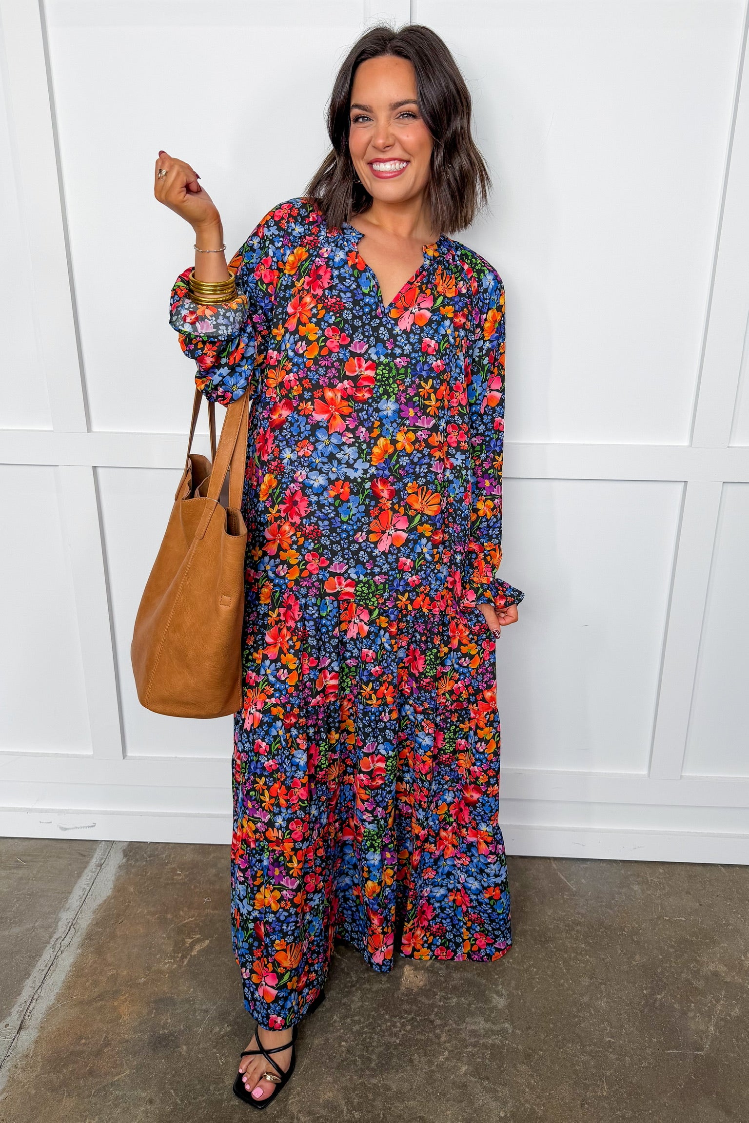 Twirl into spring with this stunning blue floral maxi dress that's bursting with bright, cheerful colors. The relaxed easy fit keeps you comfortable all day long, while long sleeves add a touch of elegance and versatility. Perfect for garden parties, casual outings, or whenever you want to feel effortlessly put-together. This dress celebrates color and comfort in the most delightful way.