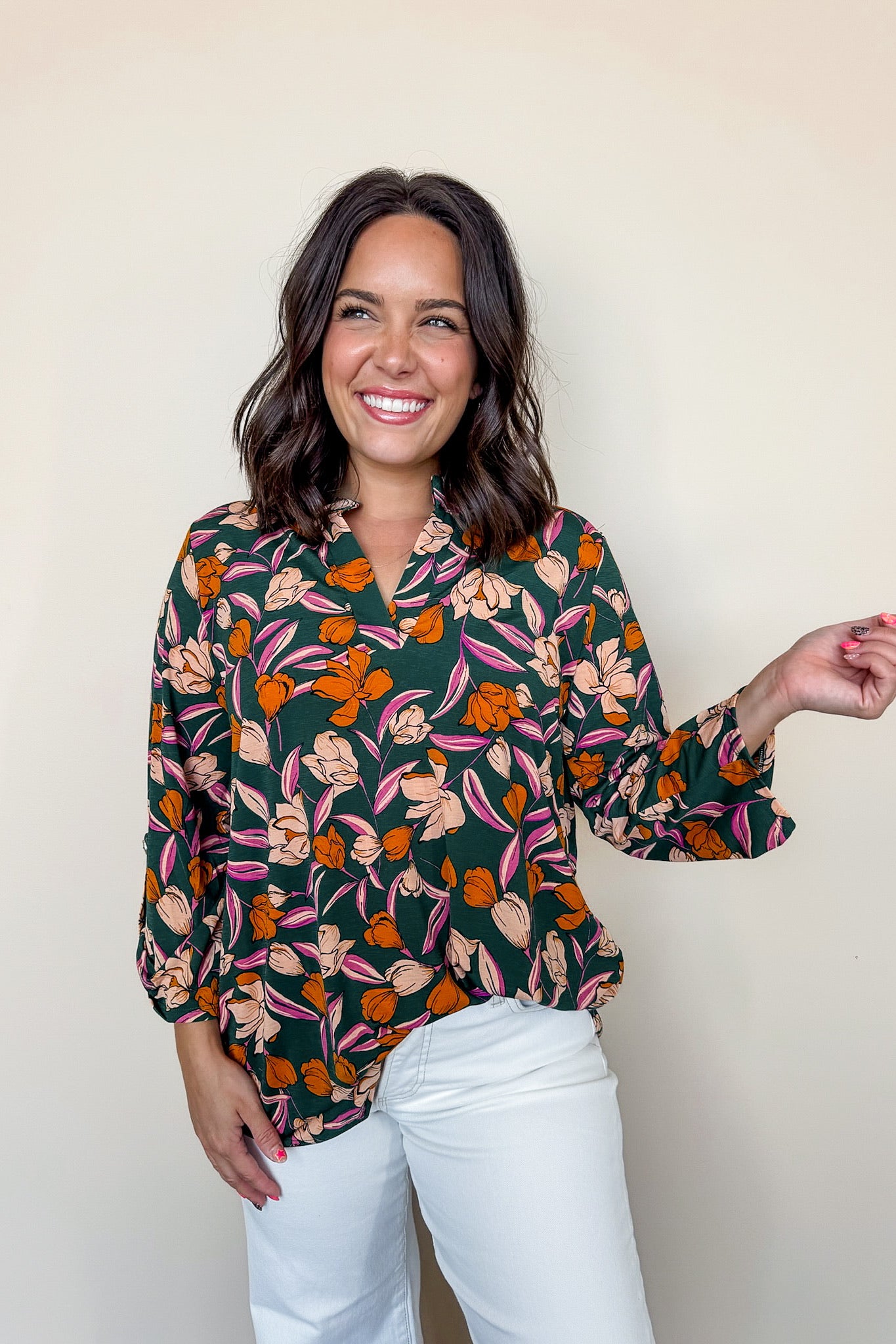 Brighten your wardrobe with the Dear Scarlett Lizzy Printed Top in Fern. This best-selling floral print features a flattering V-neck and breezy 3/4 length sleeves, perfect for effortless style with a playful twist. Its vibrant design and comfortable fit make it an easy go-to for any casual outing or lively gathering.