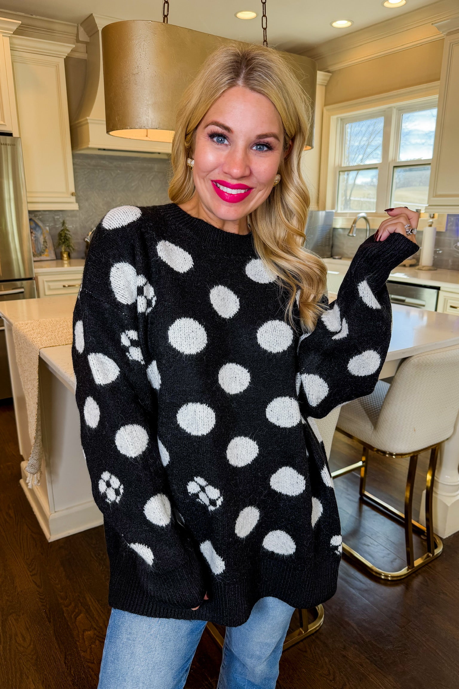 This cozy black knit sweater brings the perfect mix of playful and sporty chic. Featuring bold white polka dots accented with subtle soccer-inspired details, this sweater makes a statement without trying too hard. The relaxed oversized fit and soft knit fabric make it perfect for layering over biker shorts, denim, or leggings for effortless everyday style. Whether you're headed to a game, brunch, or just lounging in style — this one’s a standout.
