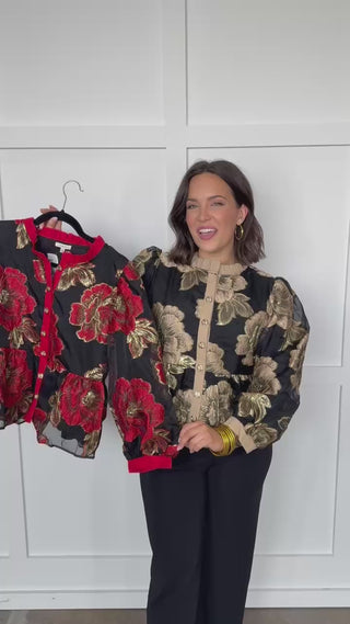Luxe Red & Black Jacquard Top with Gold Buttons