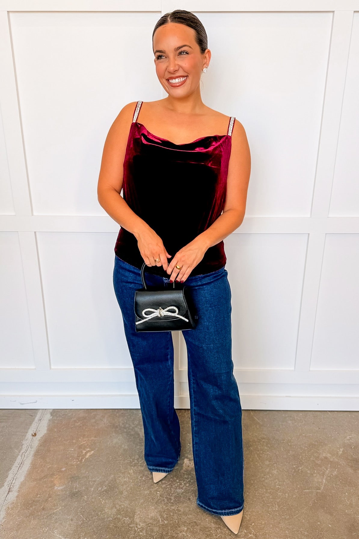 A little sparkle never hurt anybody — The Afterglow Velvet Cami is made for girls’ nights, holiday parties, and every moment you want to shine. With its luxe burgundy velvet fabric and rhinestone-detailed straps, this top brings the perfect mix of sultry and sophisticated. The draped neckline adds an effortlessly flattering touch, making it a total showstopper.