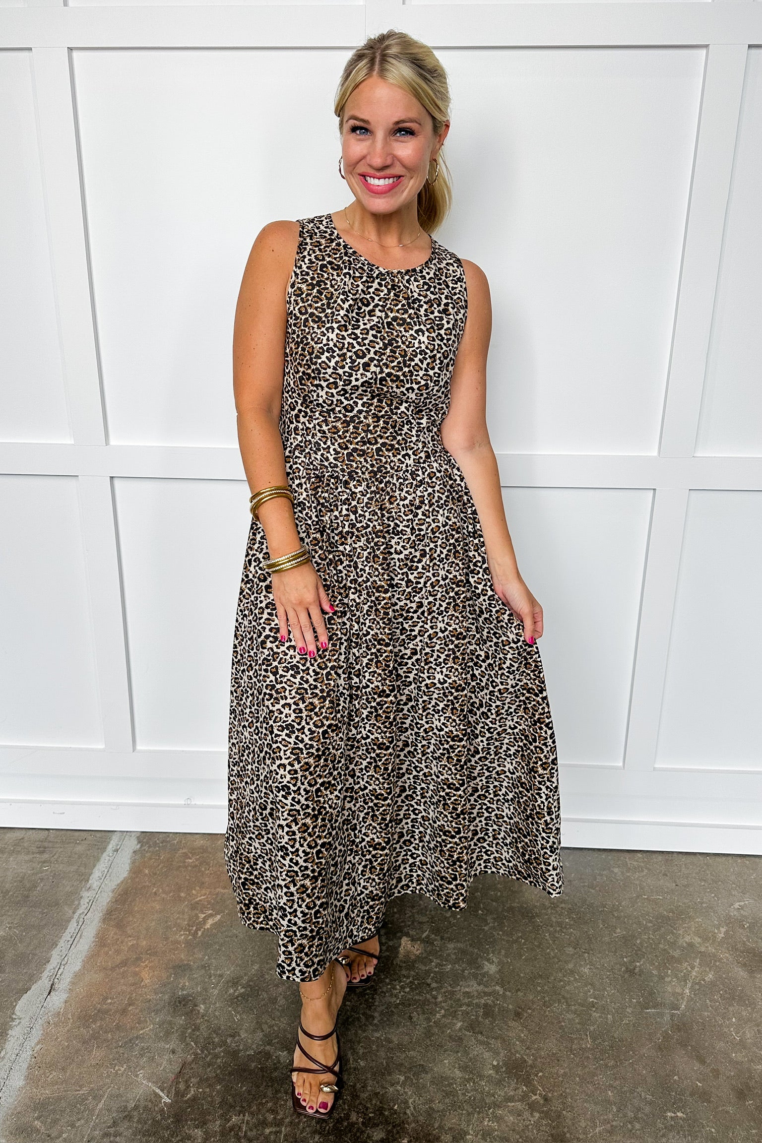 Step out in style with this playful leopard print midi dress. Featuring a high neck with a charming tie detail at the back and a convenient zipper closure, this poplin dress combines comfort with a bold, trendy look. Perfect for adding a wild touch to your wardrobe!