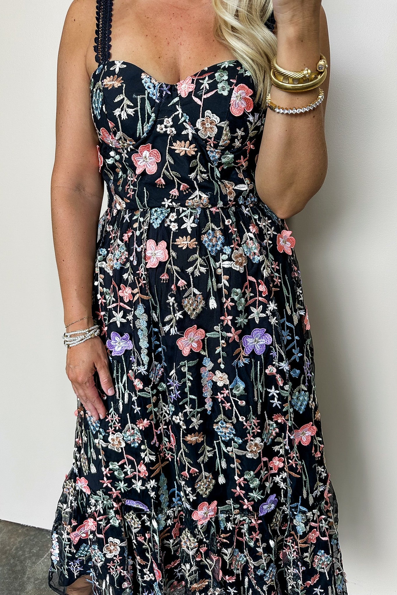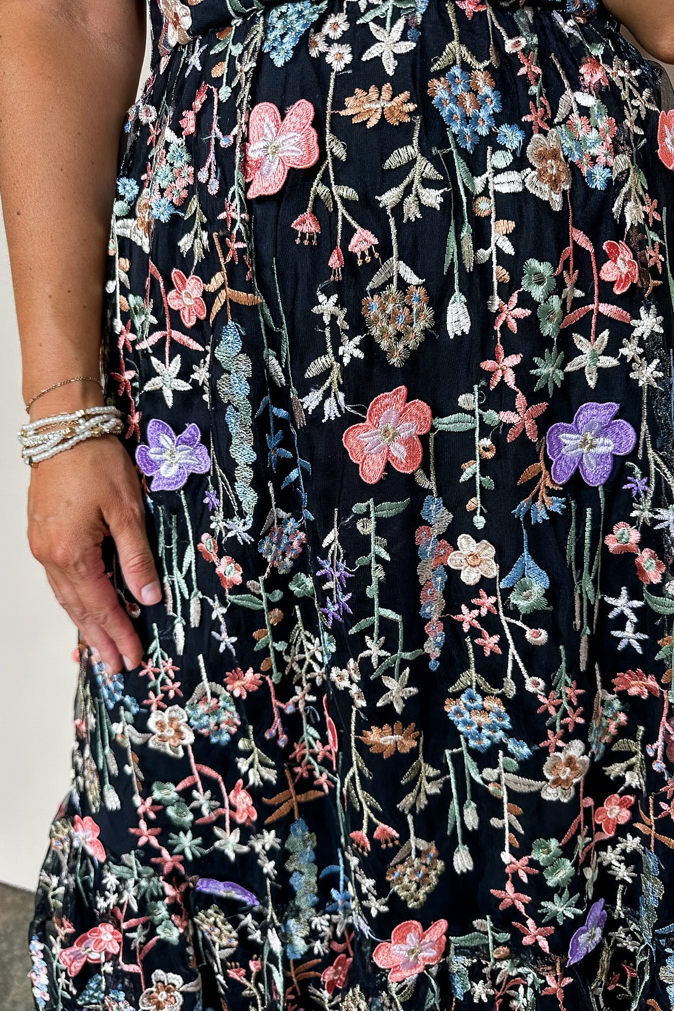This elegant black midi/maxi dress features delicate spaghetti straps and is adorned with intricately embroidered floral patterns. Its refined silhouette and detailed floral accents create a sophisticated look perfect for special occasions or stylish daytime events.