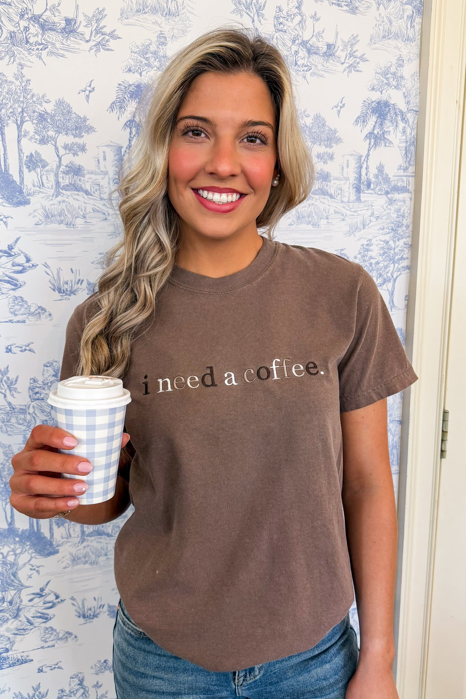 I Need A Coffee Brown Embroidered Tee