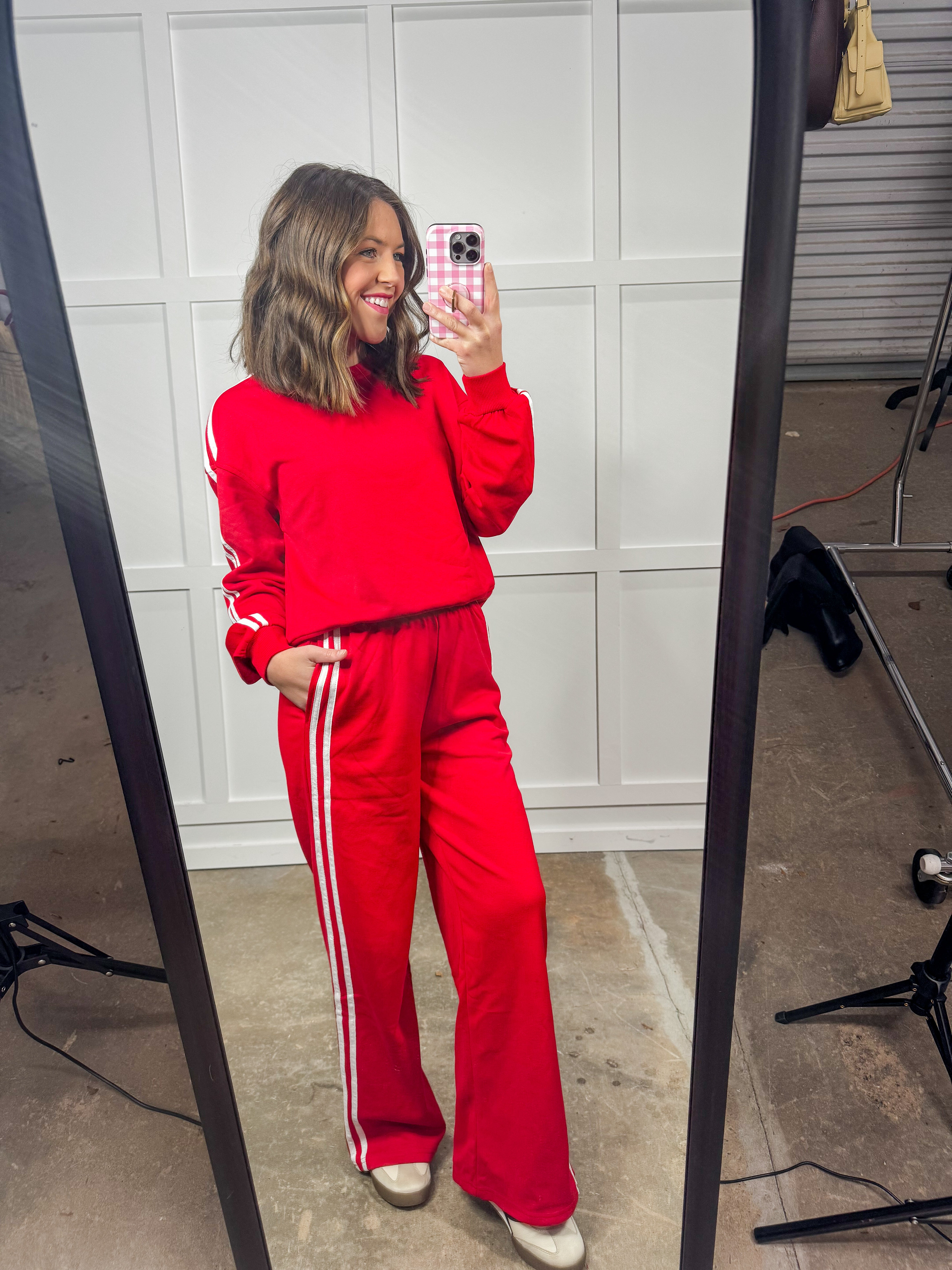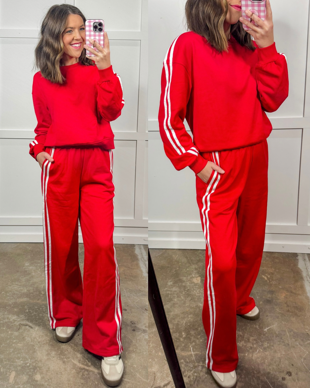 Turn heads in this bold red lounge set—made to keep you comfy and stylish. With wide-leg flowy pants and sporty side stripes, this outfit balances casual chic with effortless street flair. Perfect for travel days, errands, game-day looks, or a cute matching airport fit. Soft, stretchy, and designed to move with you—she’s giving cozy confidence in every step. Wear together for a statement look or mix & match for endless outfit combos.