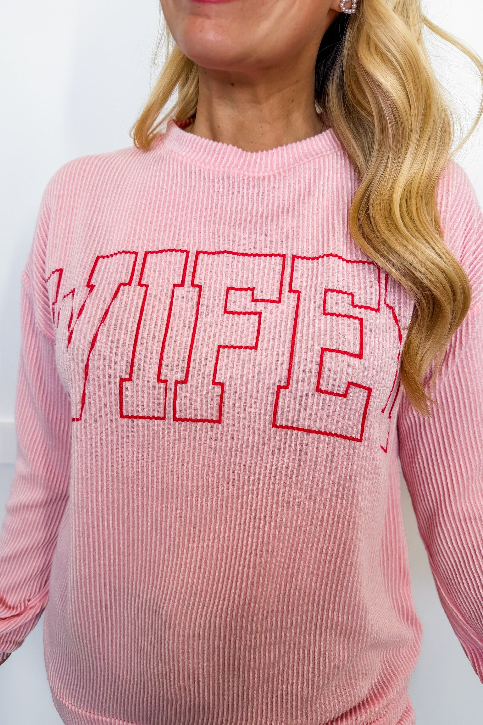 Show off your cutest cozy-girl energy with our WIFEY Varsity Pullover — the perfect lightweight knit for errands, lounging, or pairing with denim for a casual chic look. Featuring soft chenille varsity-style lettering and an easy, relaxed fit, this sweater brings the sweetest touch to your winter-to-spring wardrobe. Available in two adorable colors, it’s the definition of comfy-cute.