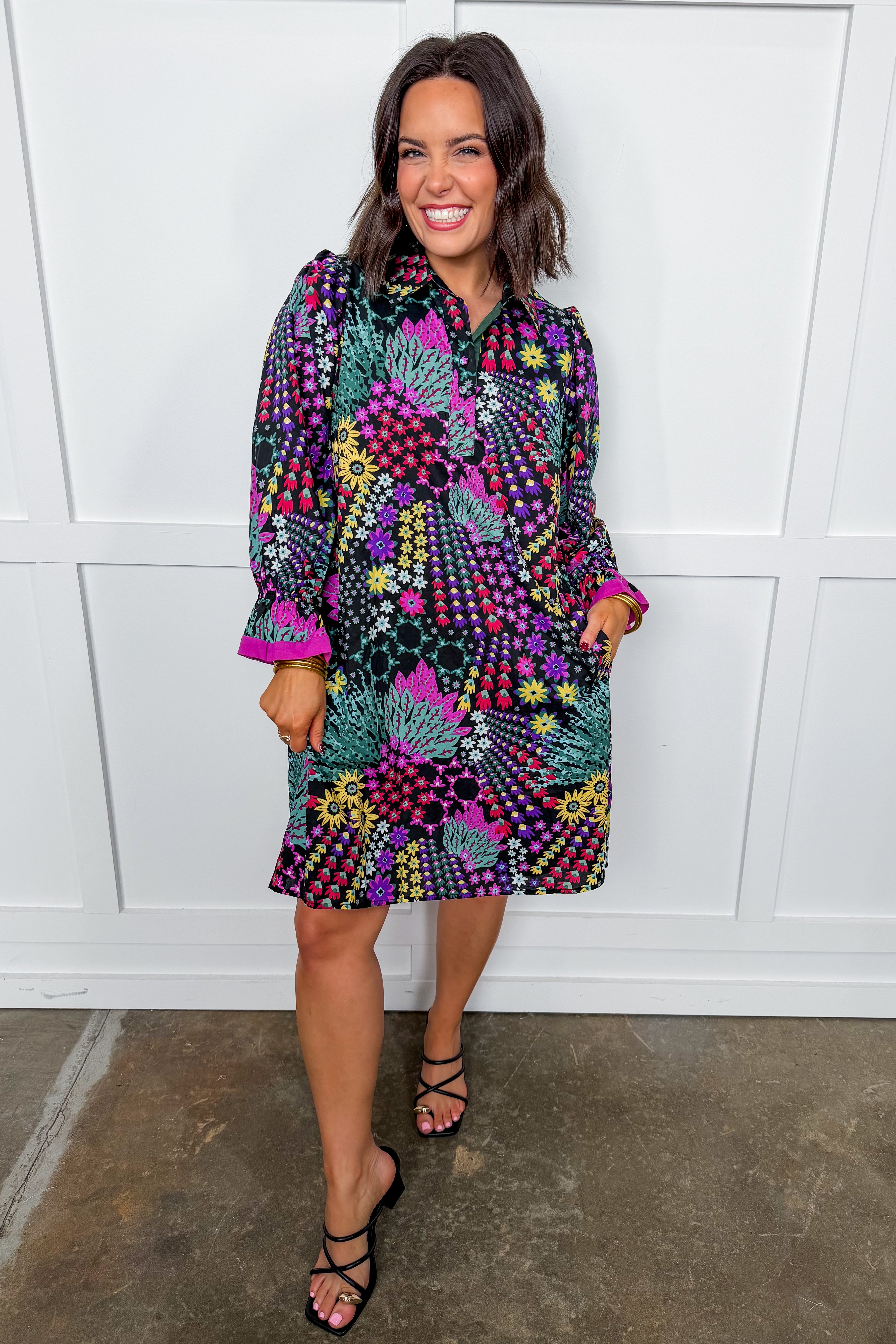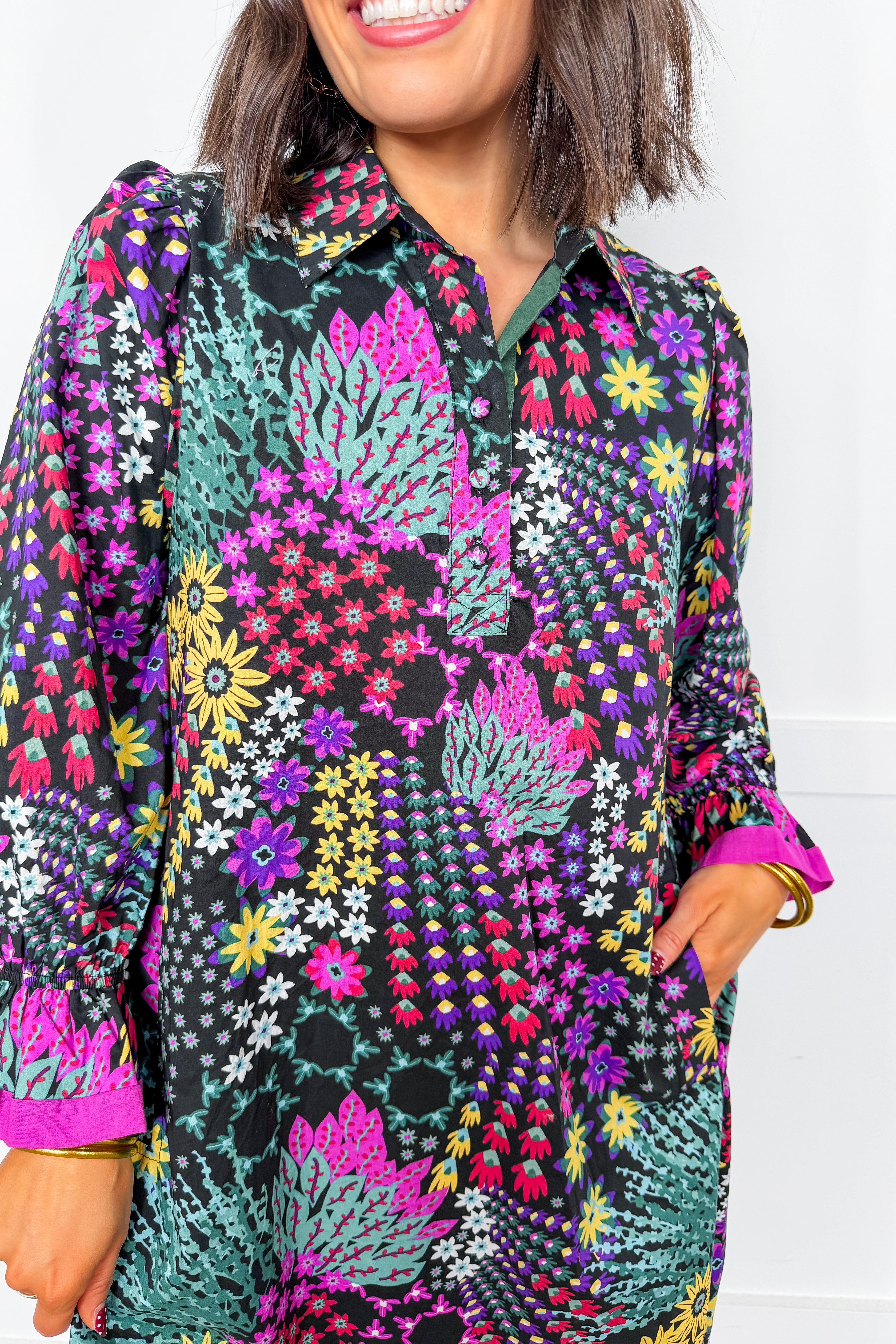 Turn heads in the perfect blend of effortless and elevated. Featuring a rich, colorful floral print against a deep background, this dress brings bold personality while staying easy to wear. The relaxed shirt-dress silhouette flatters every figure, while the playful ruffle cuffs add just the right touch of charm. Dress it up with heels or keep it casual with boots or sneakers — this one does it all.