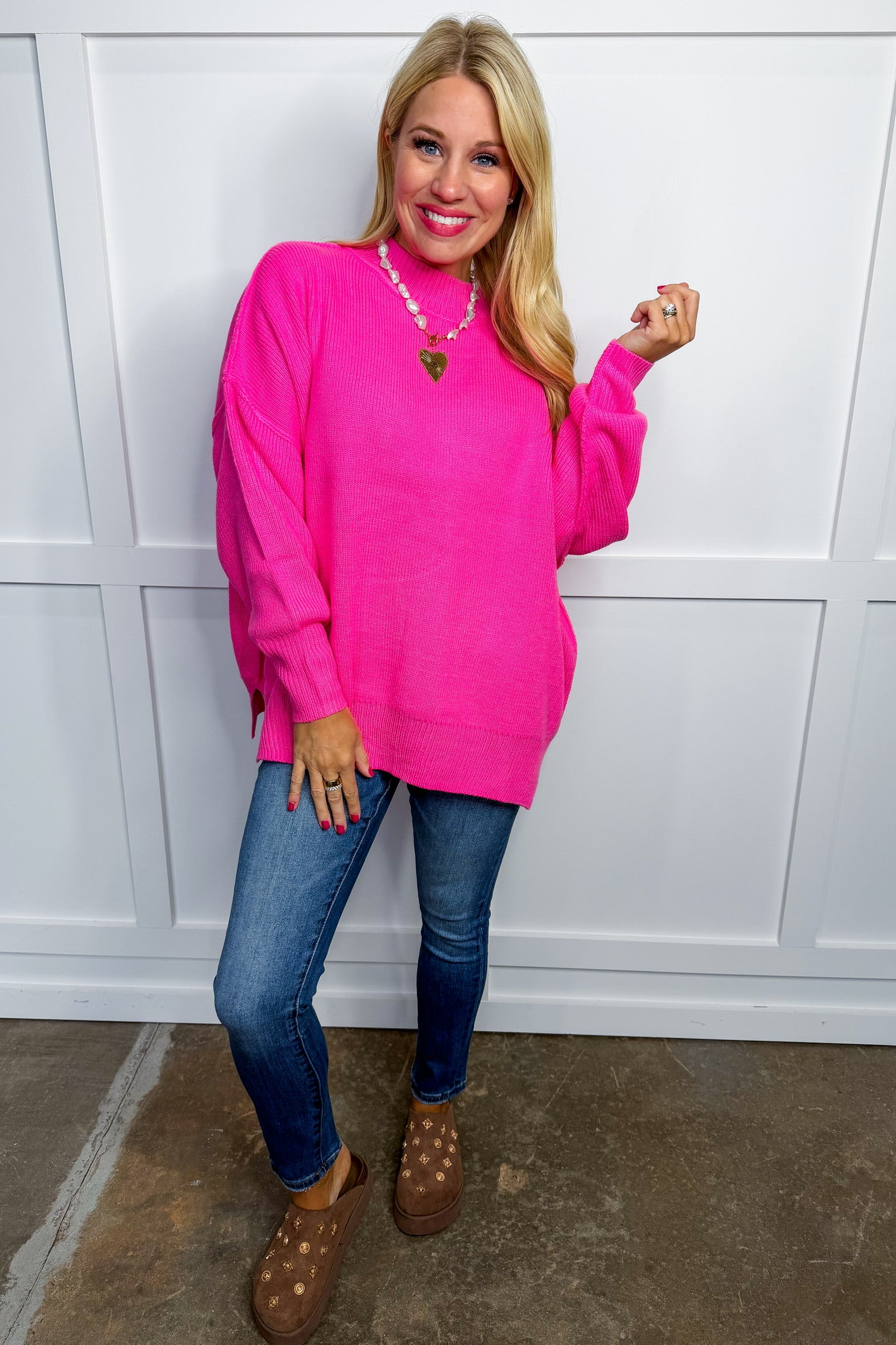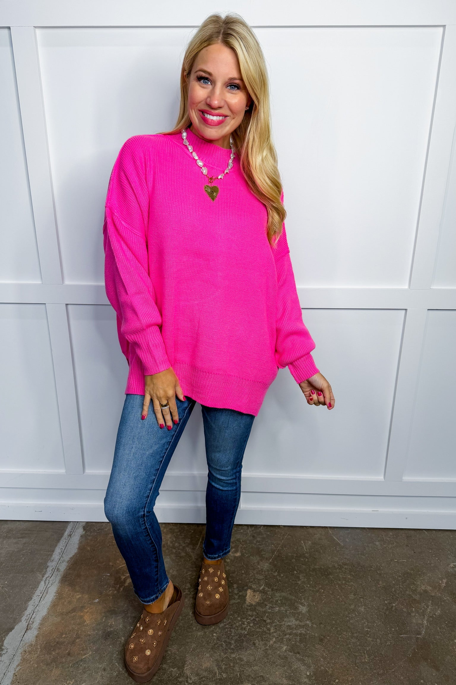 This playful pink sweater features a mock neck and long sleeves with a comfy, slightly oversized fit. Its reversed seam adds a unique touch to a fun, bubblegum shade perfect for brightening up any outfit.