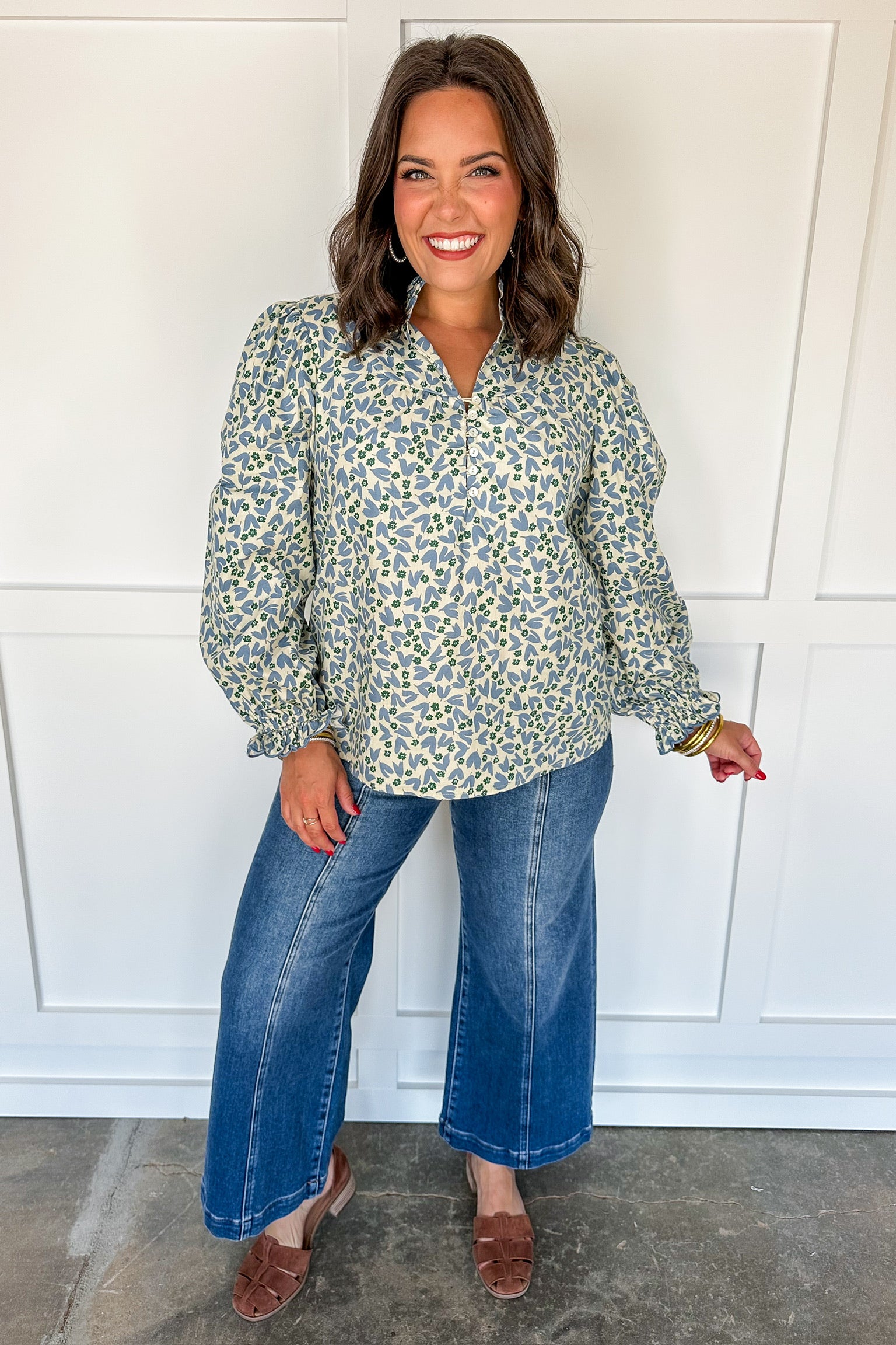 This playful V-neck blouse features long sleeves with charming fitted ruffle details that add a flirty touch. Designed to hit right at the mid-waist, it pairs beautifully with your favorite jeans or skirts. Available in a lovely blue and beige floral print, it also comes in a soft pink option to brighten your wardrobe.