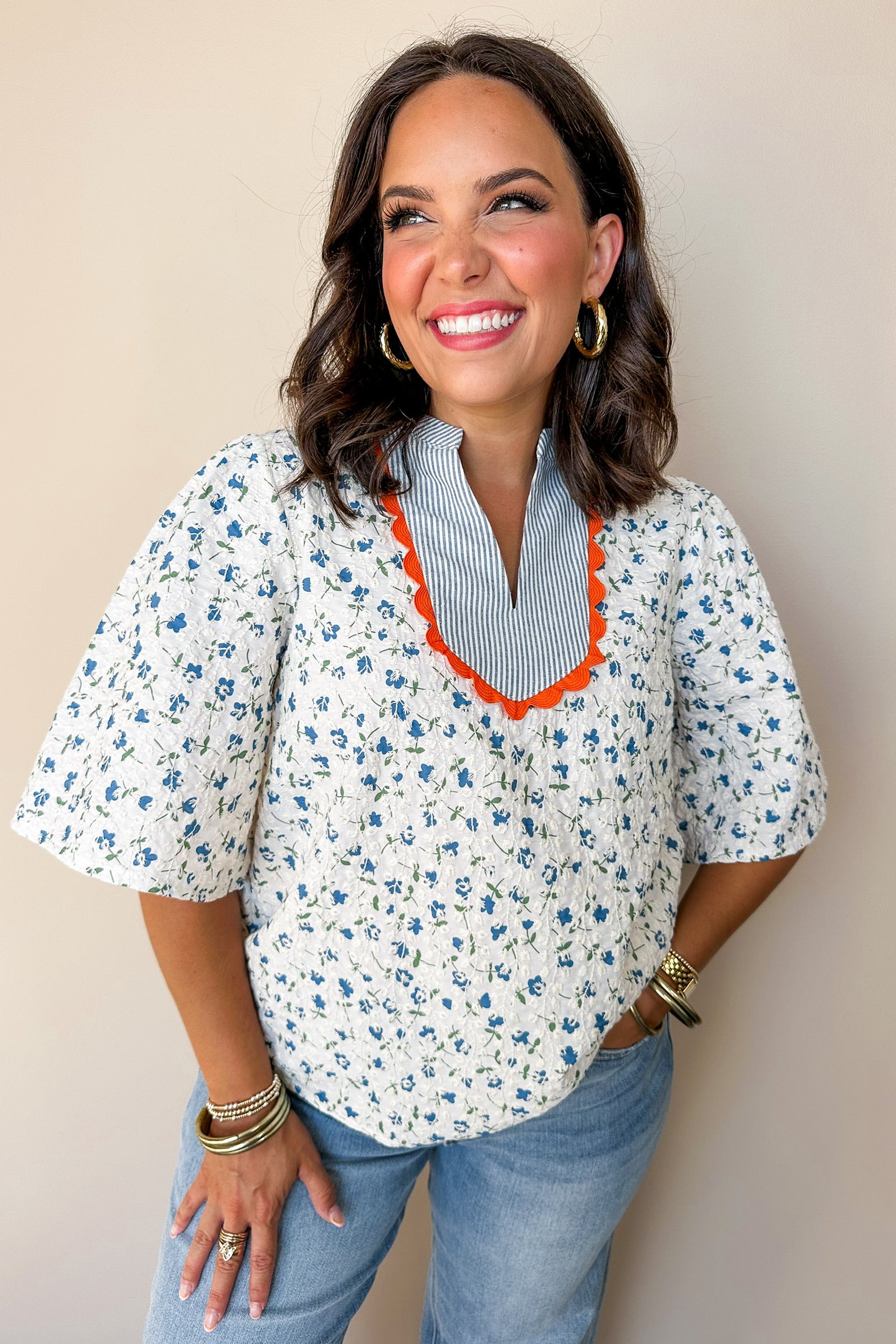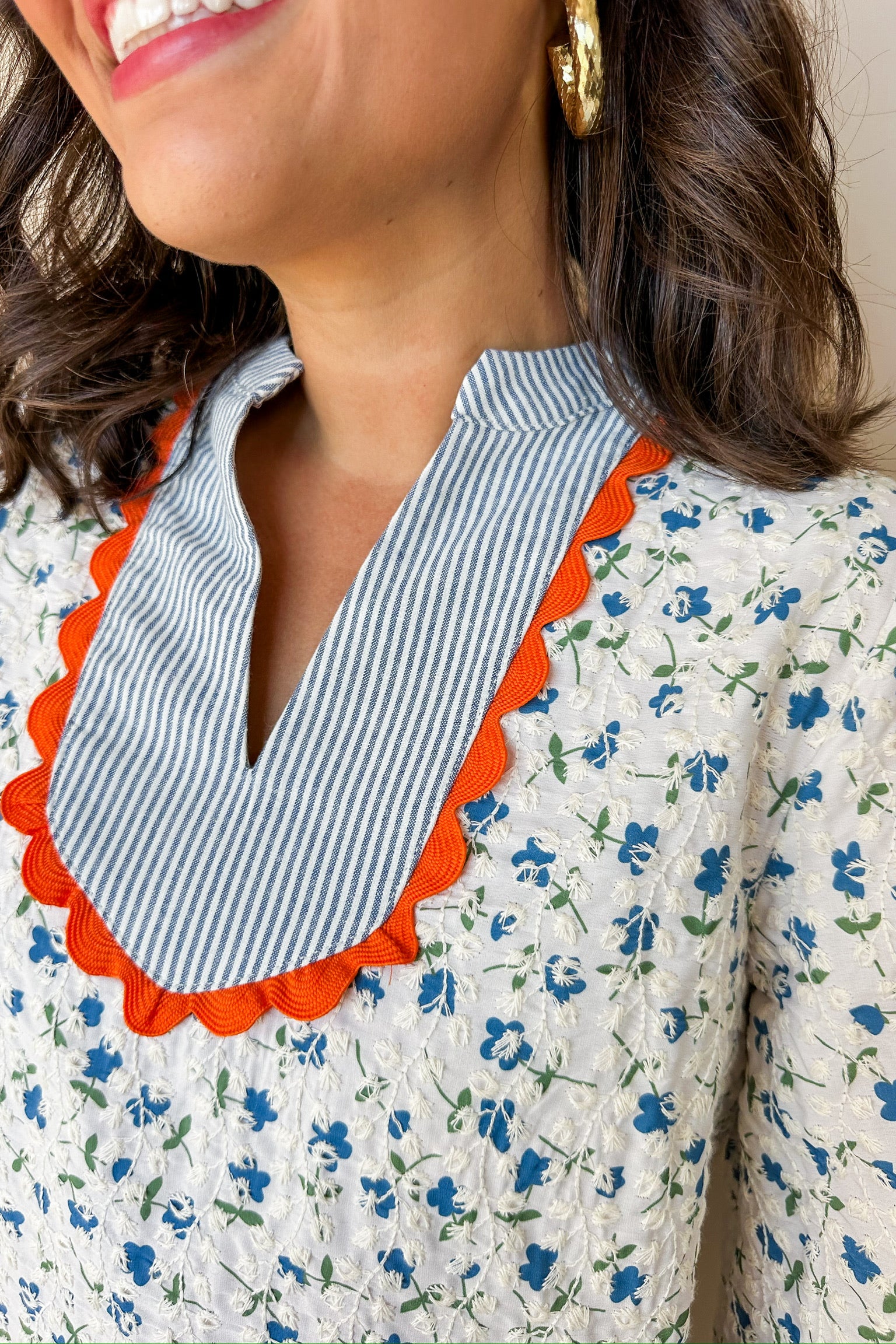 Bring a pop of color to your back-to-school wardrobe with this adorable blue and white floral top. Featuring playful stripe details and a unique orange scallop trim, it’s the perfect mix of sweet and fun. Made from a comfortable blend of 50% polyester and 50% cotton, this top is lightweight and easy to wear all day long. Pair it with jeans, shorts, or a skirt for an effortlessly cute and stylish look.