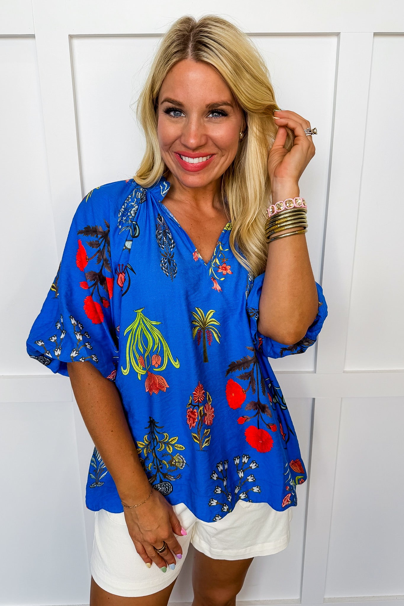 Bright, bold, and full of personality, the Fresh Cut Floral Blouse is a true statement piece. Designed with a flattering V-neckline, playful scallop trim, and airy balloon sleeves, this top brings effortless charm to any outfit. The vibrant floral print adds an artful touch, while the relaxed fit keeps it comfortable and easy to wear. Available in two eye-catching colors, it’s the perfect top for adding a pop of color to your everyday look.