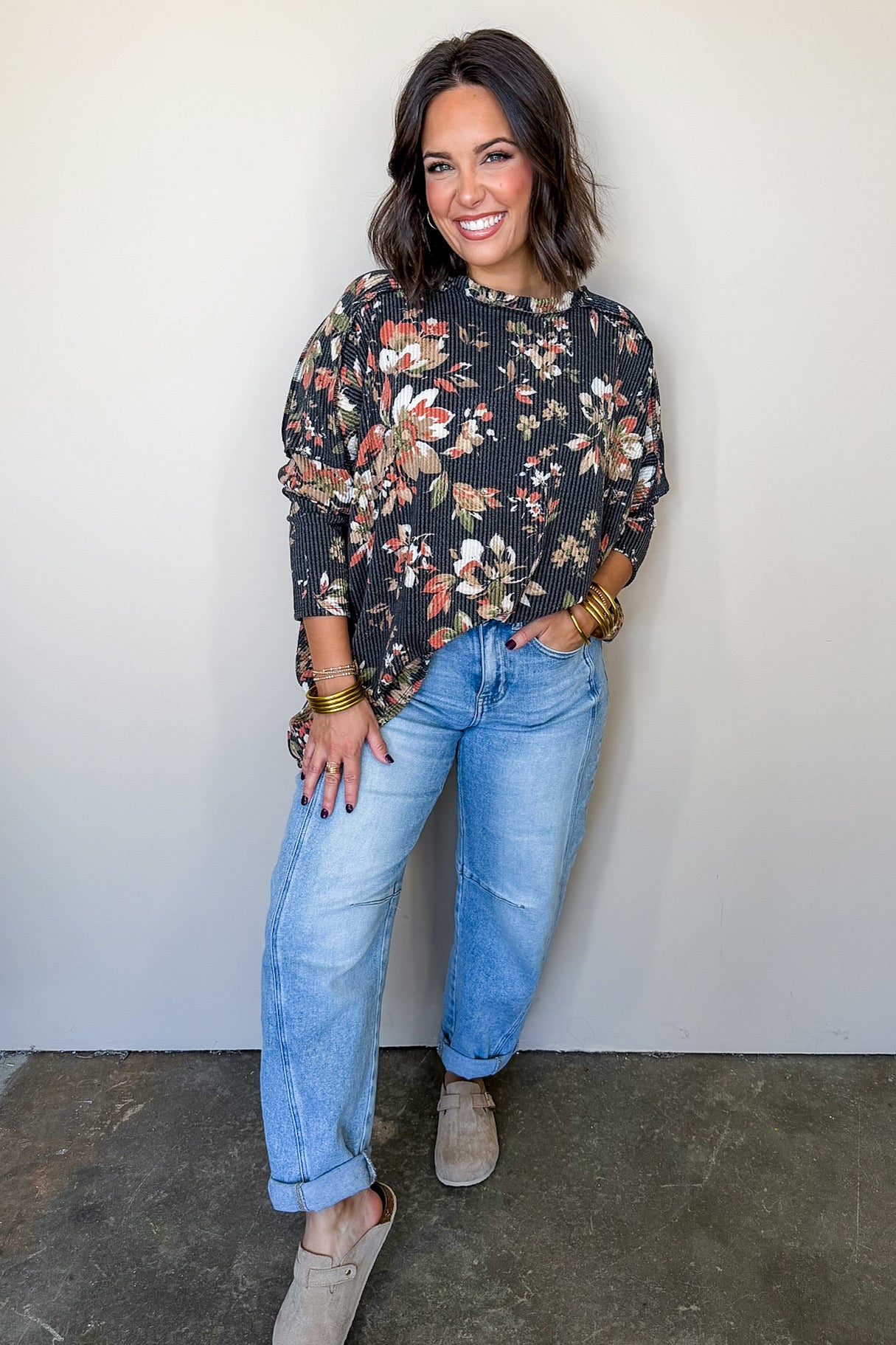 Fall florals done right 🍂 Our Golden Harvest Floral Blouse brings warm tones + effortless style to your wardrobe.This playful floral pullover features a round neckline and long sleeves for cozy comfort. Designed with an oversized, flowy fit, it showcases a charming black and tan floral print.