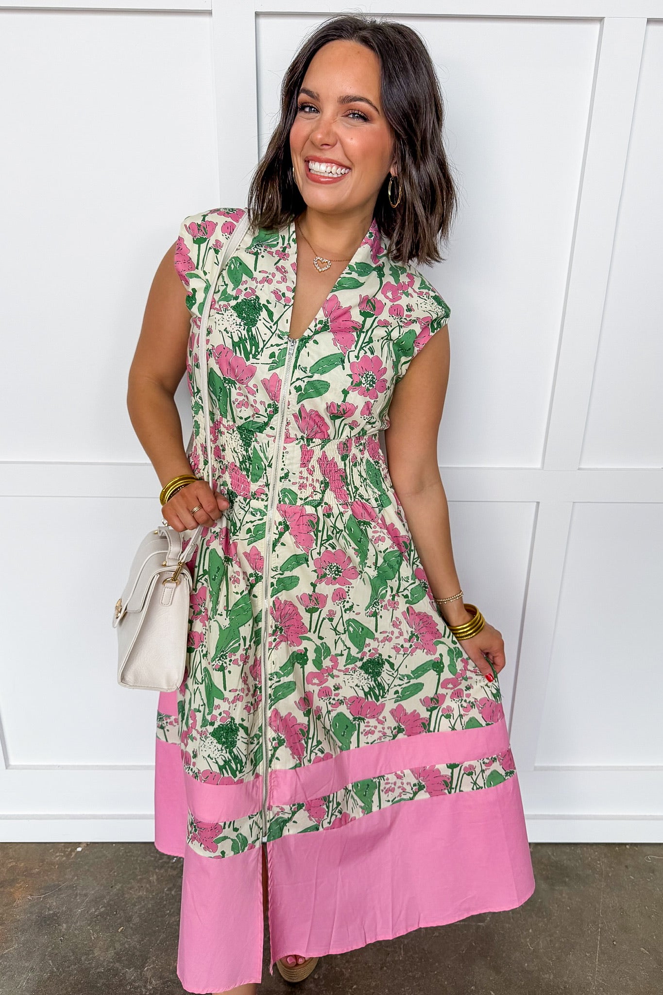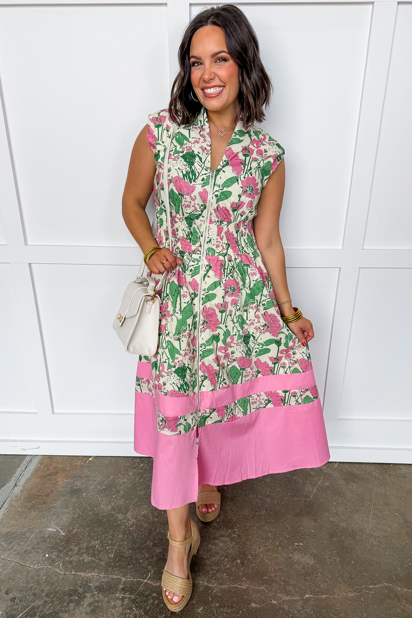Best Selling Krissy Zip-up Midi Stripe Dress in Pink Garden Floral