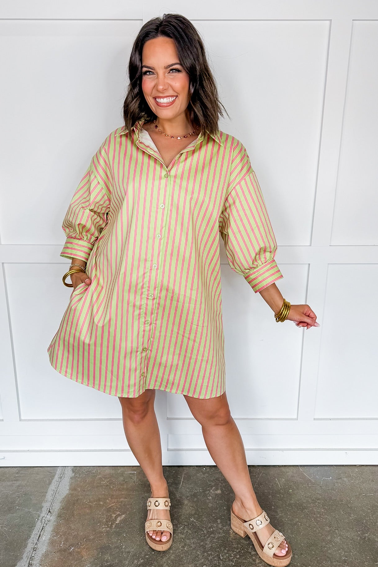 Bold, playful, and impossible to ignore — The Punchline Stripe Dress is here to brighten up your wardrobe. Featuring vibrant pink and green vertical stripes and a classic button-front silhouette, this dress blends preppy charm with statement style. The relaxed, slightly oversized fit keeps it effortlessly cool, while the crisp collar and cuffed sleeves add just the right amount of polish. Easy to throw on and instantly put-together, this piece is perfect for brunch dates, vacation strolls, tailgates, or sunny afternoons out and about. Fun, flattering, and full of personality — she’s the outfit that makes the plans.