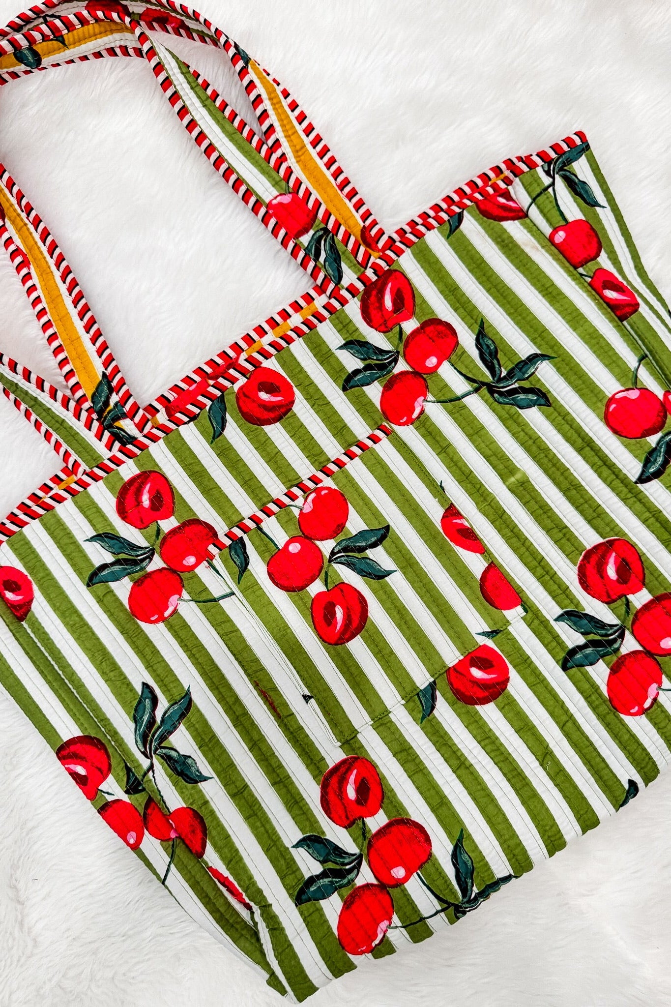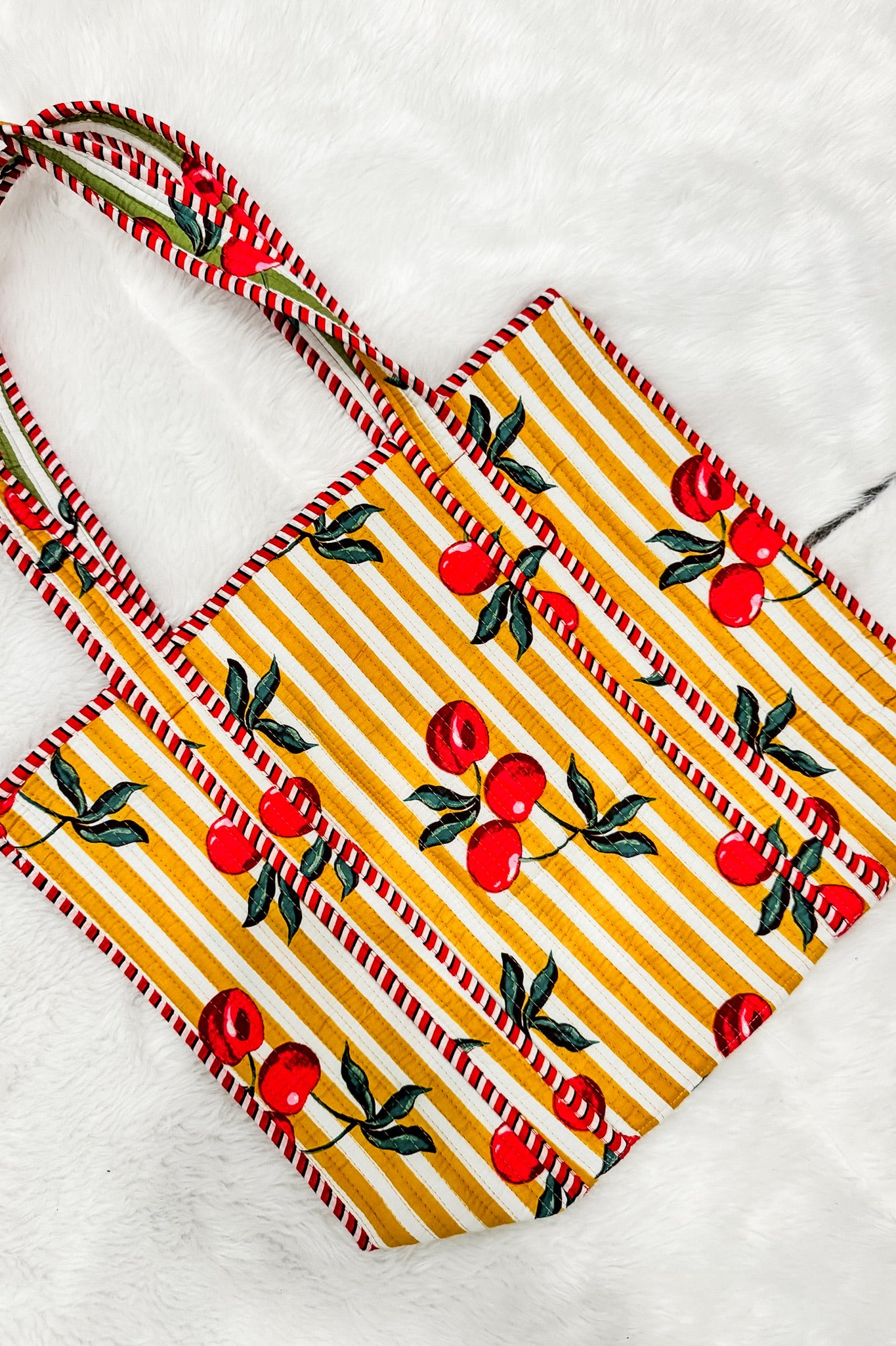 Hot Pink Deal - Stripe & Cherry Print Reversible Quilted Bag