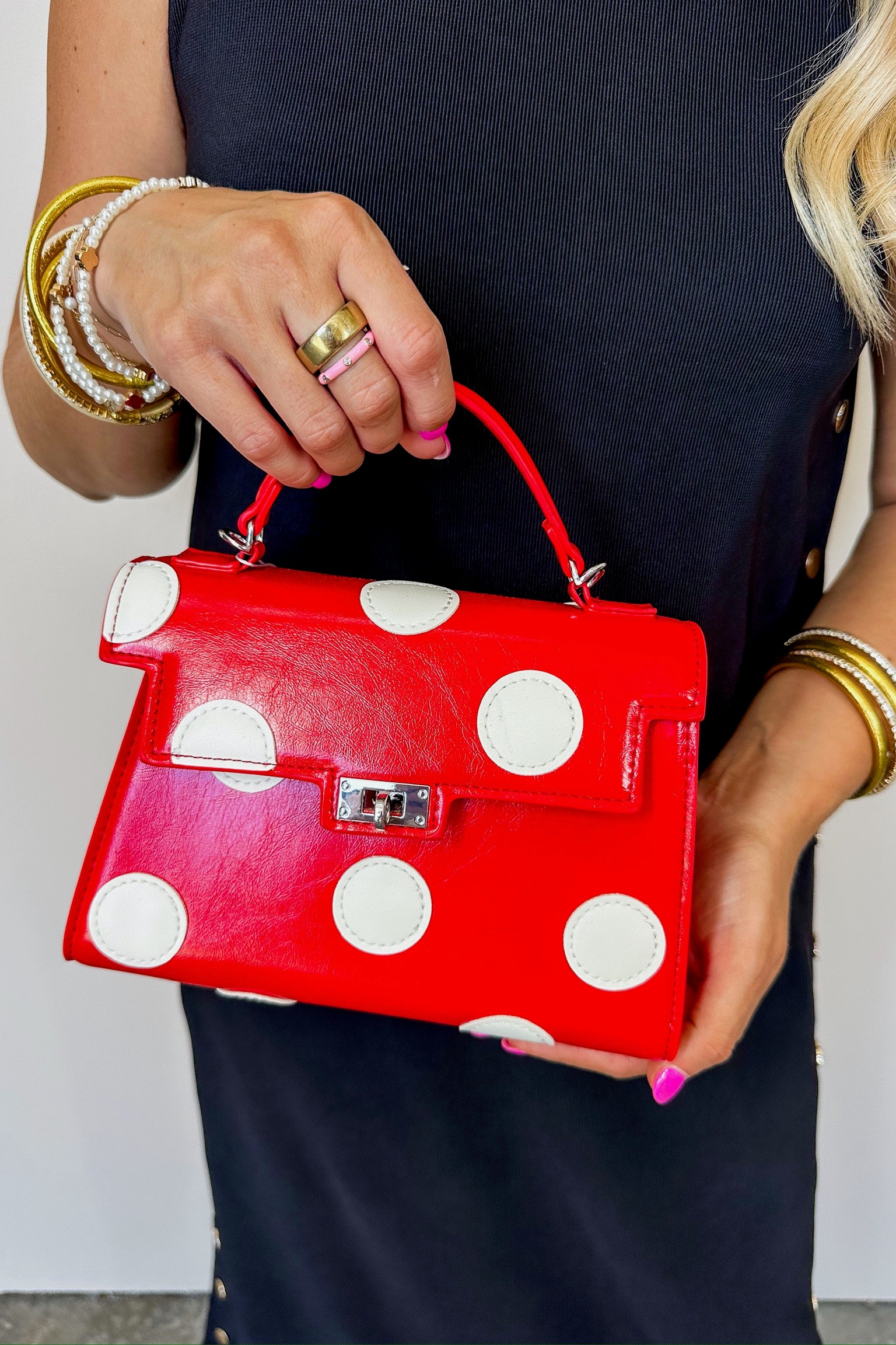 Add a pop of playful charm to any outfit with the Dot Darling Mini Bag. This red polka dot handbag is the perfect size for your essentials, featuring a structured silhouette and cute top handle for easy carrying. Whether you’re heading to brunch, date night, or a day out with friends, this mini bag is sure to turn heads and brighten your look.