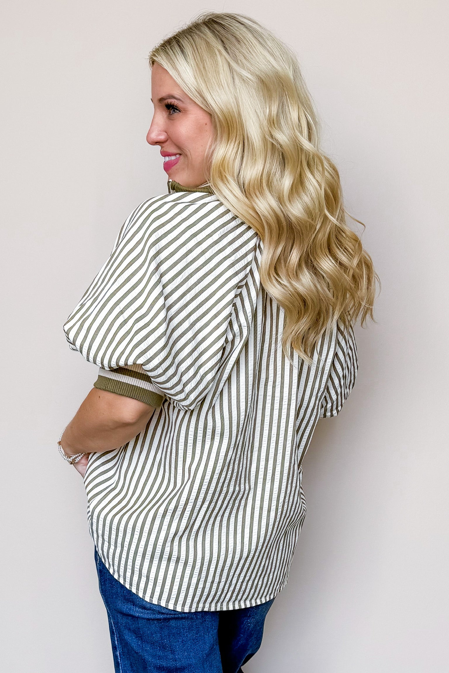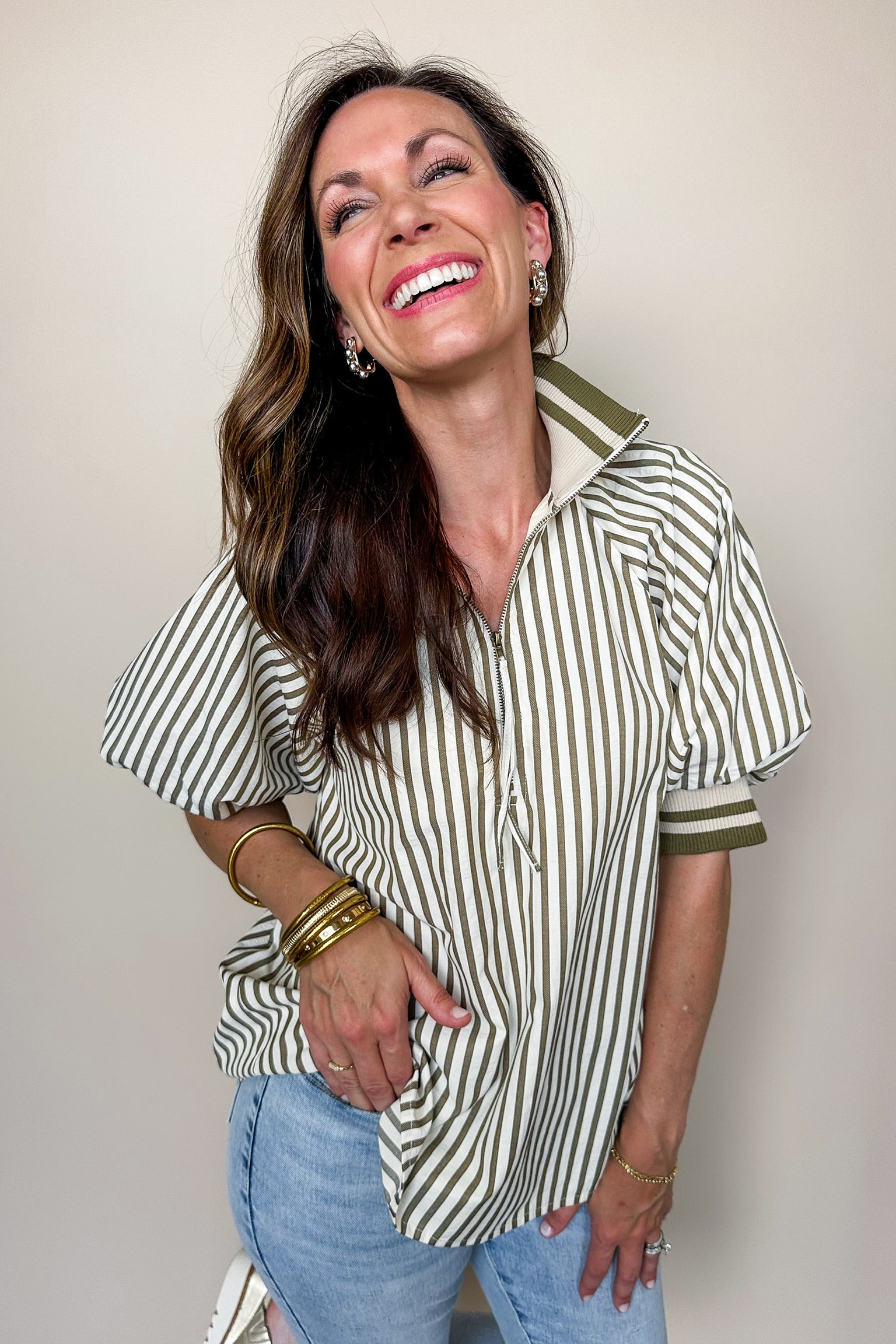 This striped top with a zipper v-neck and puff sleeves adds a fun twist to your casual look. Its playful design pairs perfectly with your favorite jeans, making it an easy choice for days when comfort meets style.