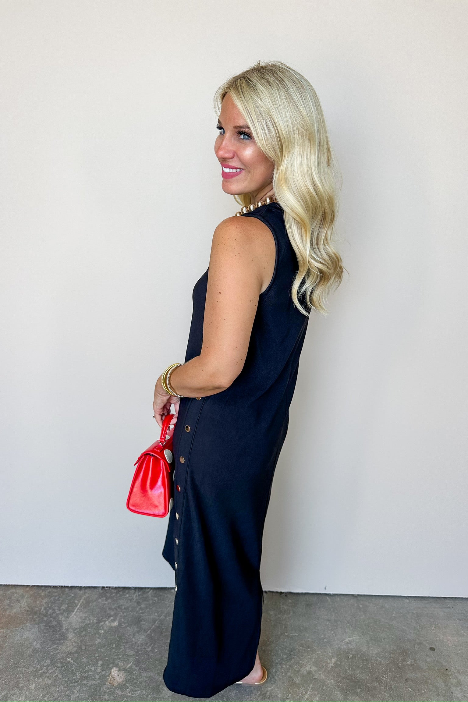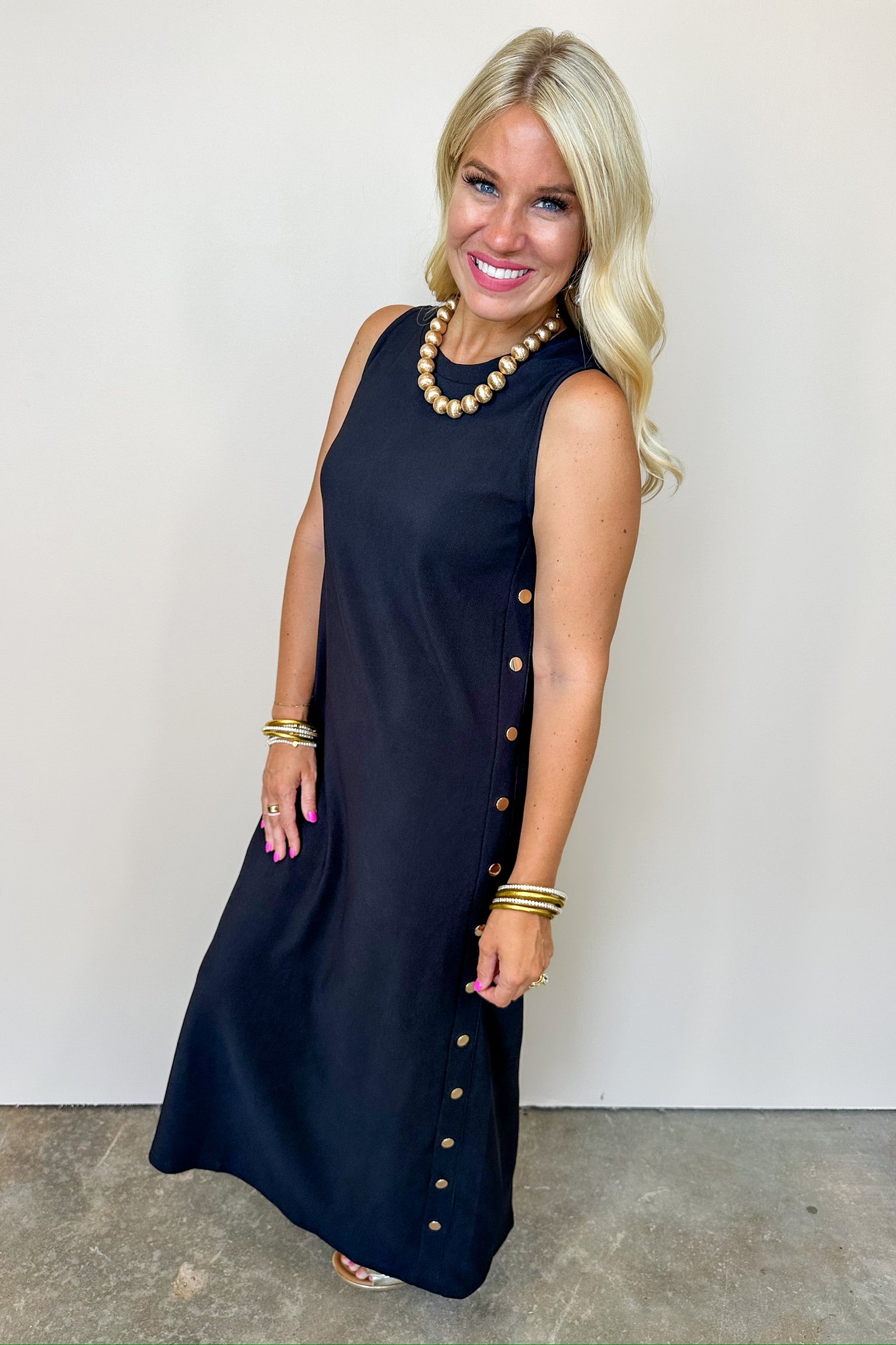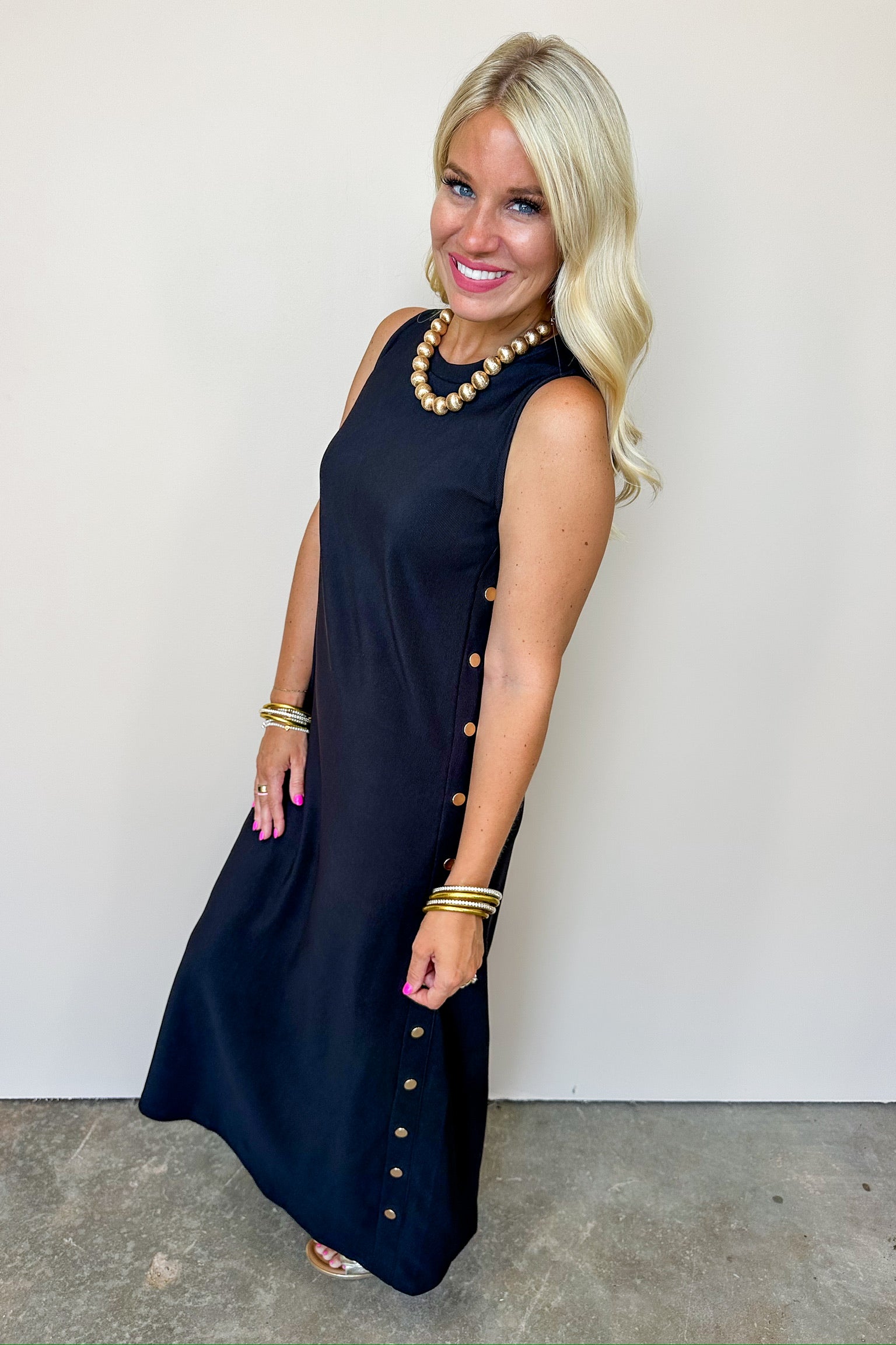 This classy midi black dress hugs your curves with its form-fitting design and thicker fabric, perfect for those in-between seasons. Featuring a chic high neck and sleeveless cut, it’s both stylish and comfortable. The gold button detail down the side adds a touch of sparkle, making it a fun choice for day or night. Embrace transitional weather with this charming and versatile piece.