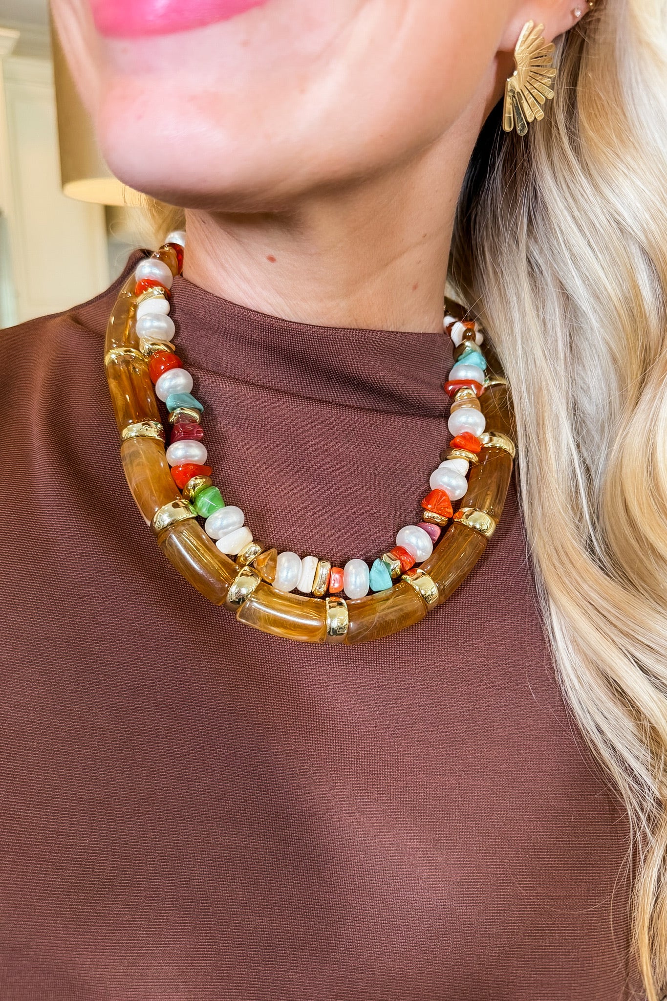 Make an effortlessly chic statement. Featuring glossy amber-hued resin links accented with gold detailing, this necklace captures the perfect balance of vintage glam and modern polish. It’s the ideal piece to pair with sweaters, button-downs, or evening dresses for a touch of golden warmth and shine.