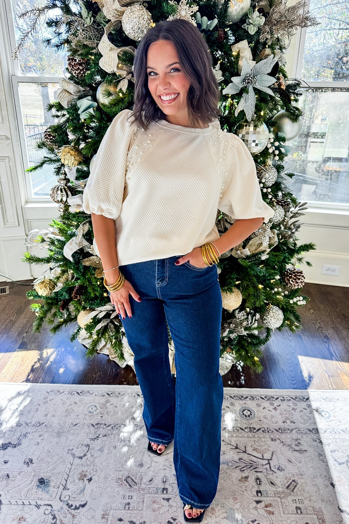 Turn simple into stunning with The Cream Beaded Top! This feminine blouse features embroidered accents and puff sleeves that make it the perfect mix of classic and playful. Pair it with denim, skirts, or holiday trousers for an easy, pulled-together look that stands out all season long.
