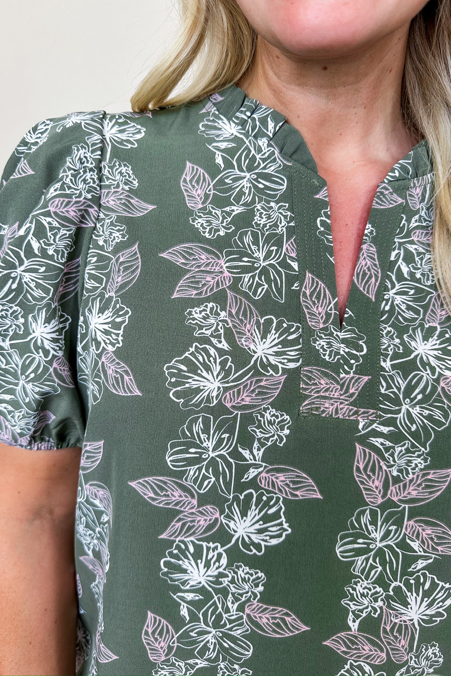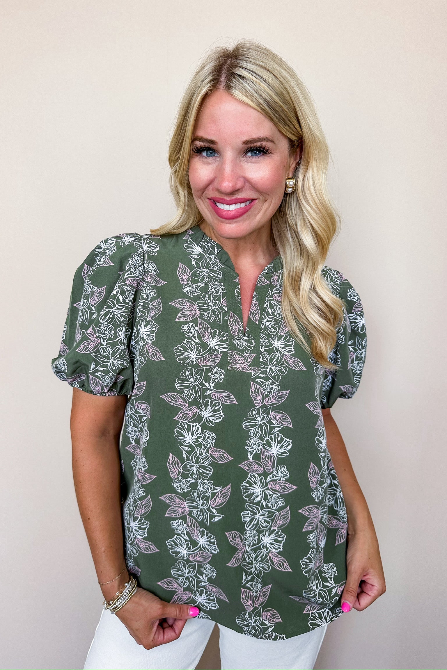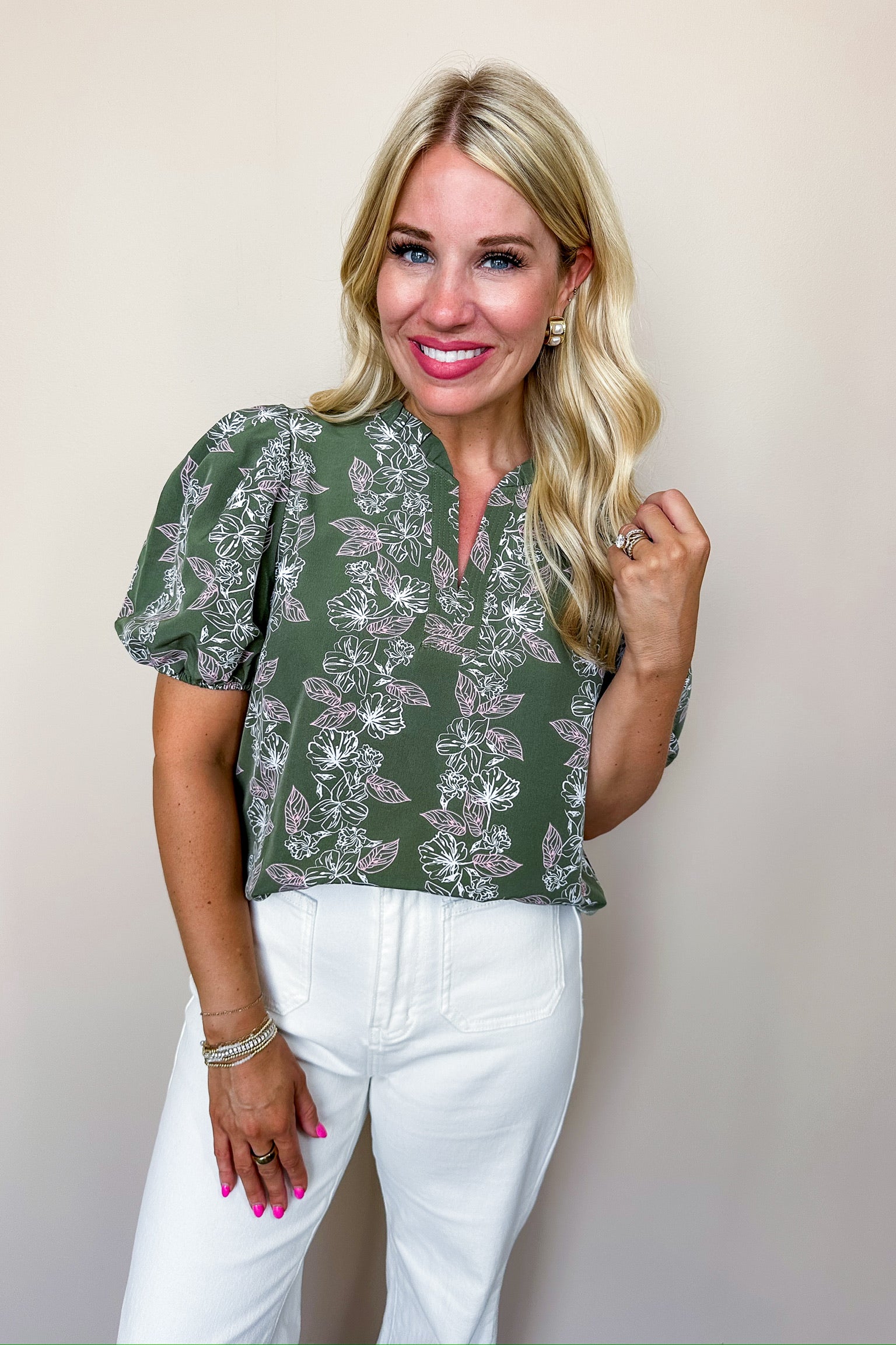 Add a touch of whimsy to your wardrobe with the Lainey Secret Garden Top in Green. Featuring a delicate white floral print and charming balloon sleeves, this blouse brings playful elegance to any outfit. The flattering V-neck detail adds a hint of allure, making it perfect for both casual days and special occasions.