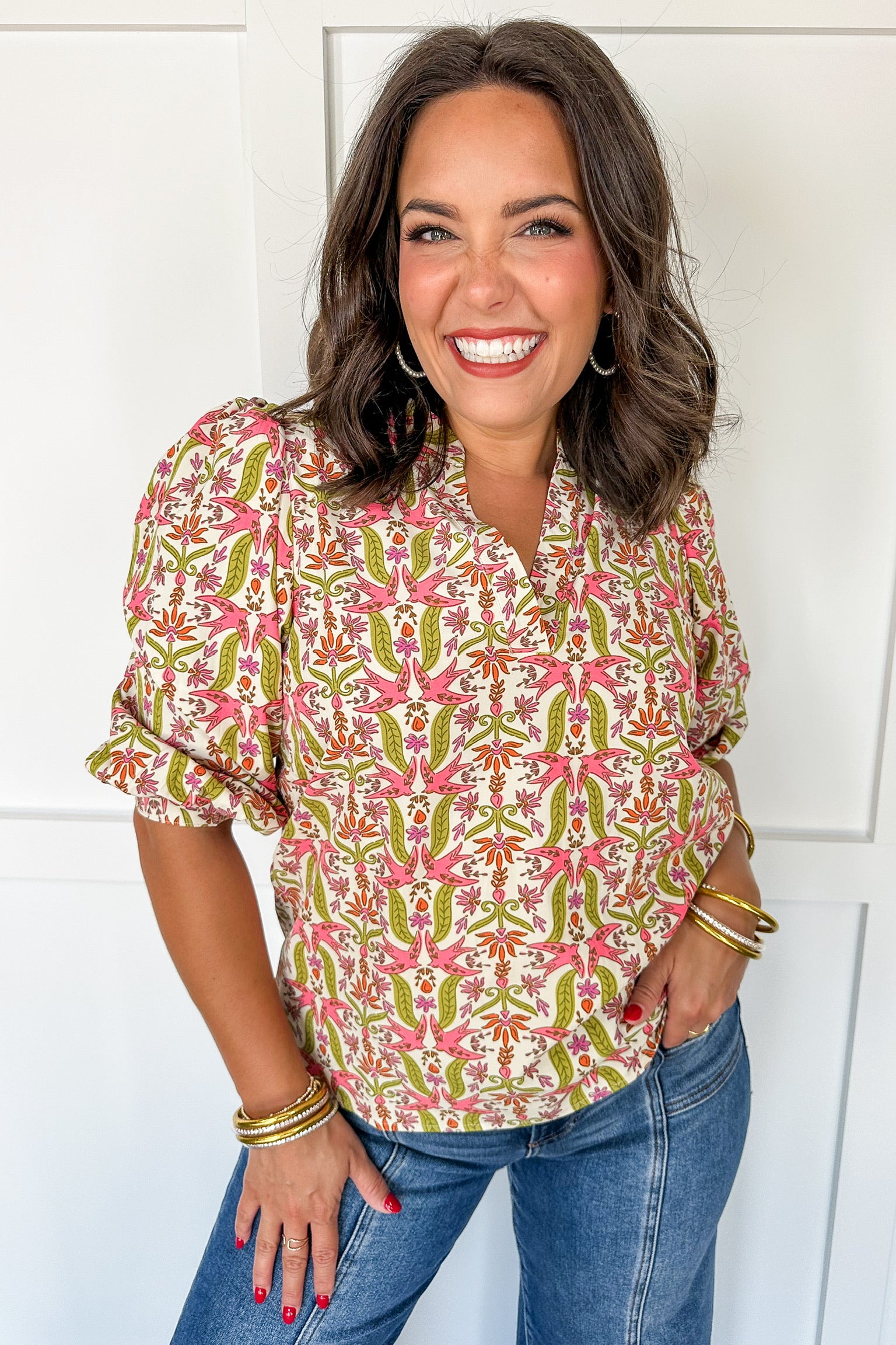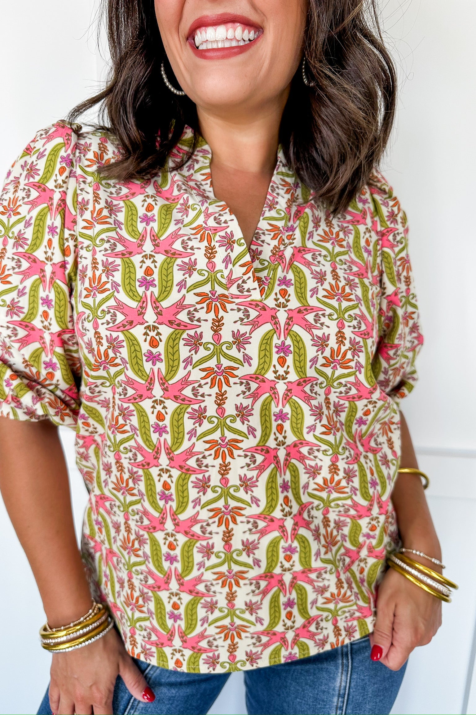 Bring a fresh, playful vibe to your wardrobe with the Mary Square Tamryn Top in Gossamer Wings Coral. This mid-length blouse features a flattering V-neck detail and charming 3/4 length ruffle sleeves that add a touch of flirty movement. The delicate floral pattern in coral tones makes it perfect for sunny days and casual outings, blending comfort with effortless style.