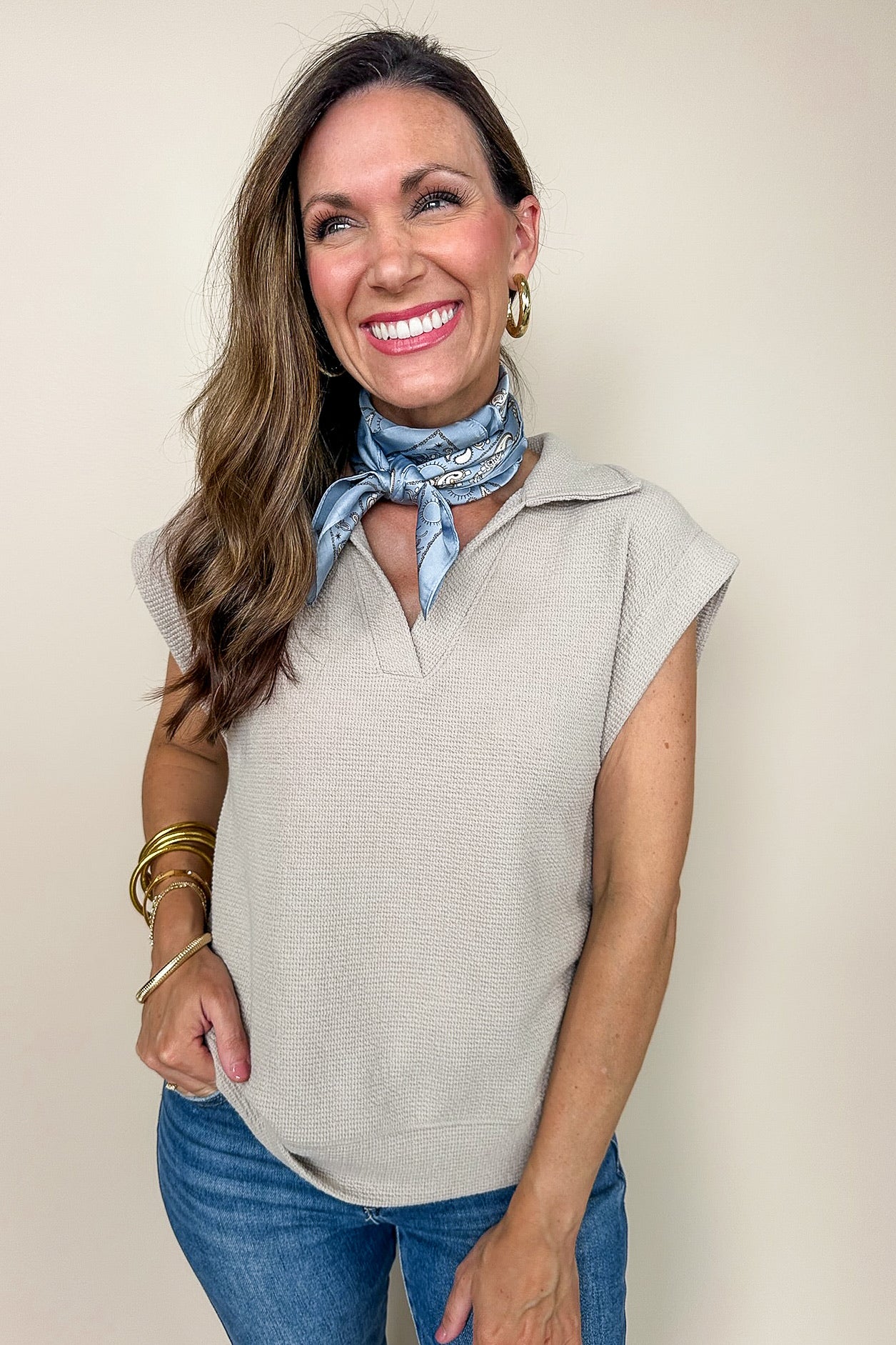 Collared Notch Neck Cap Sleeve Top in Taupe