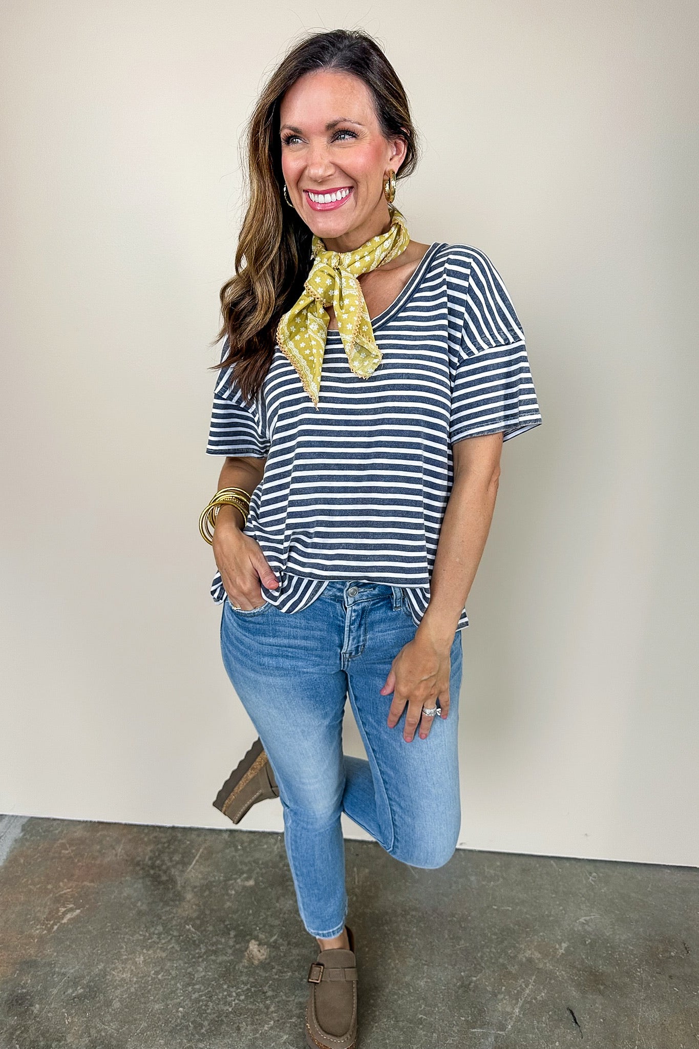Stay stylish and comfortable in this navy and white striped boxy tee. With its laid-back crew neck, short sleeves, and playful split hem at the bottom, this tee adds a fun twist to your casual wardrobe. Perfect for mixing and matching on any sunny day!